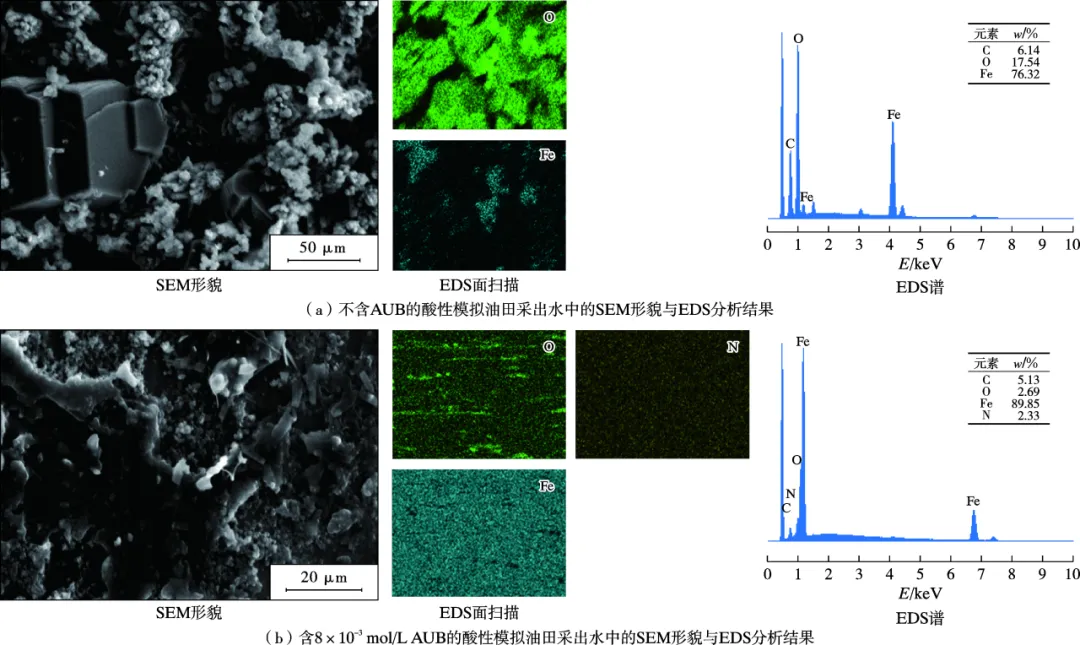 Q235钢在不含或含8×10-3 mol/L AUB的酸性模拟油田采出水中的SEM形貌与EDS分析结果