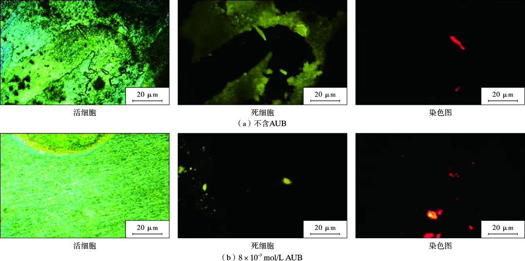 Q235钢在不含或含8×10-3 mol/L AUB的含SRB的模拟油田采出水中孵育7 d后表面的荧光显微镜图和活细胞、死细胞染色图
