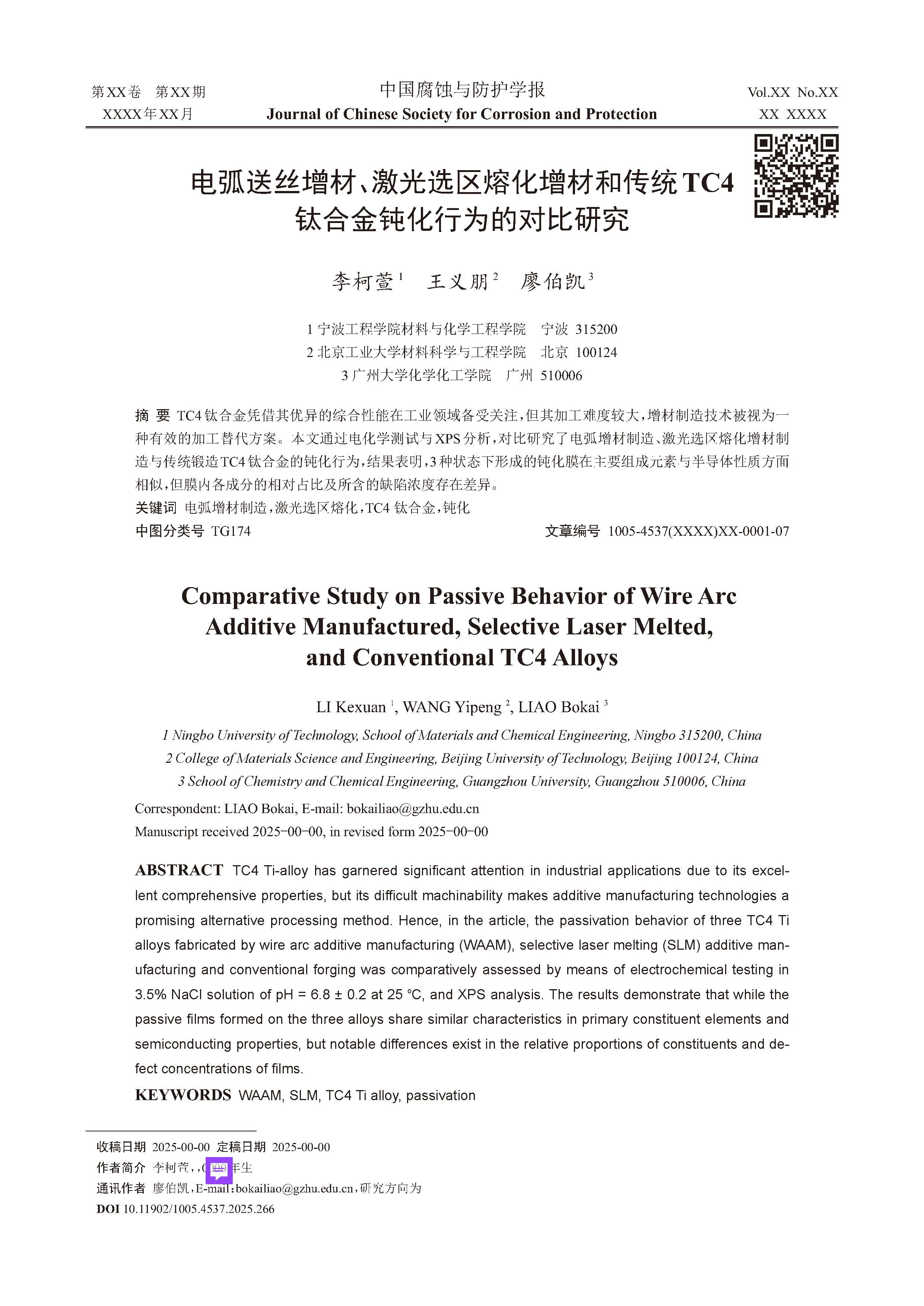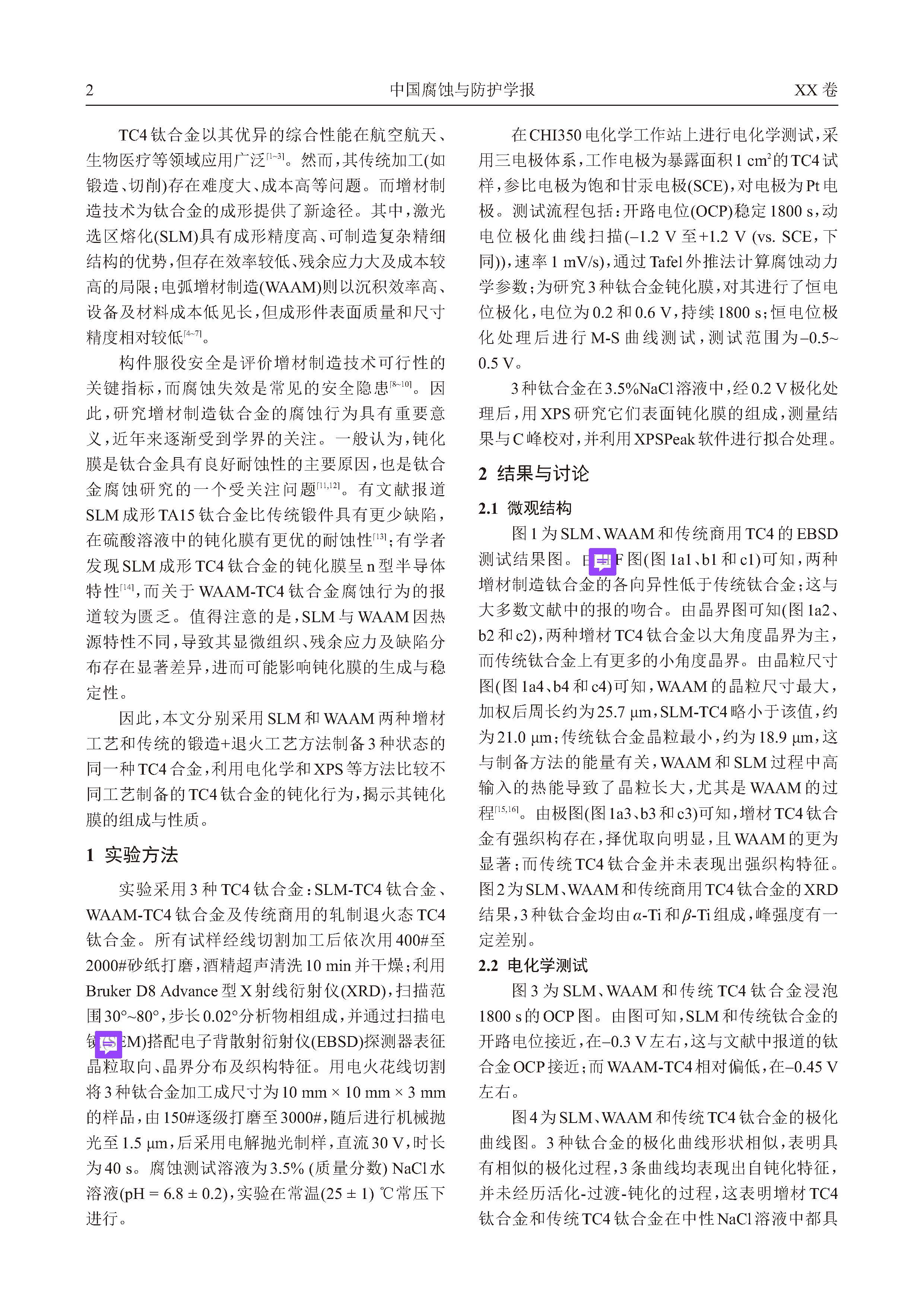 电弧送丝增材、激光选区熔化增材和传统TC4 钛合金钝化行为的对比研究