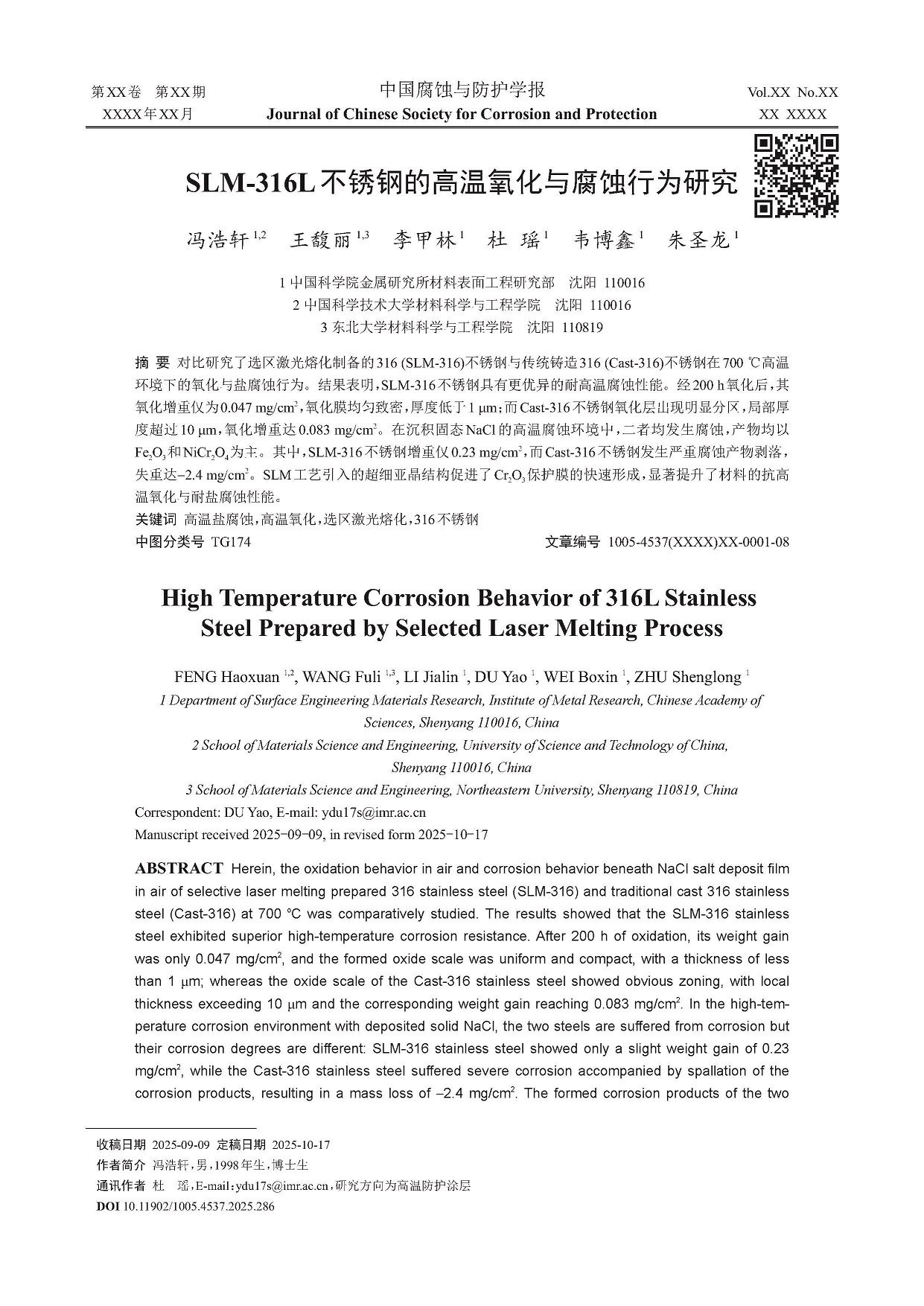 来源:中国腐蚀与防护学报