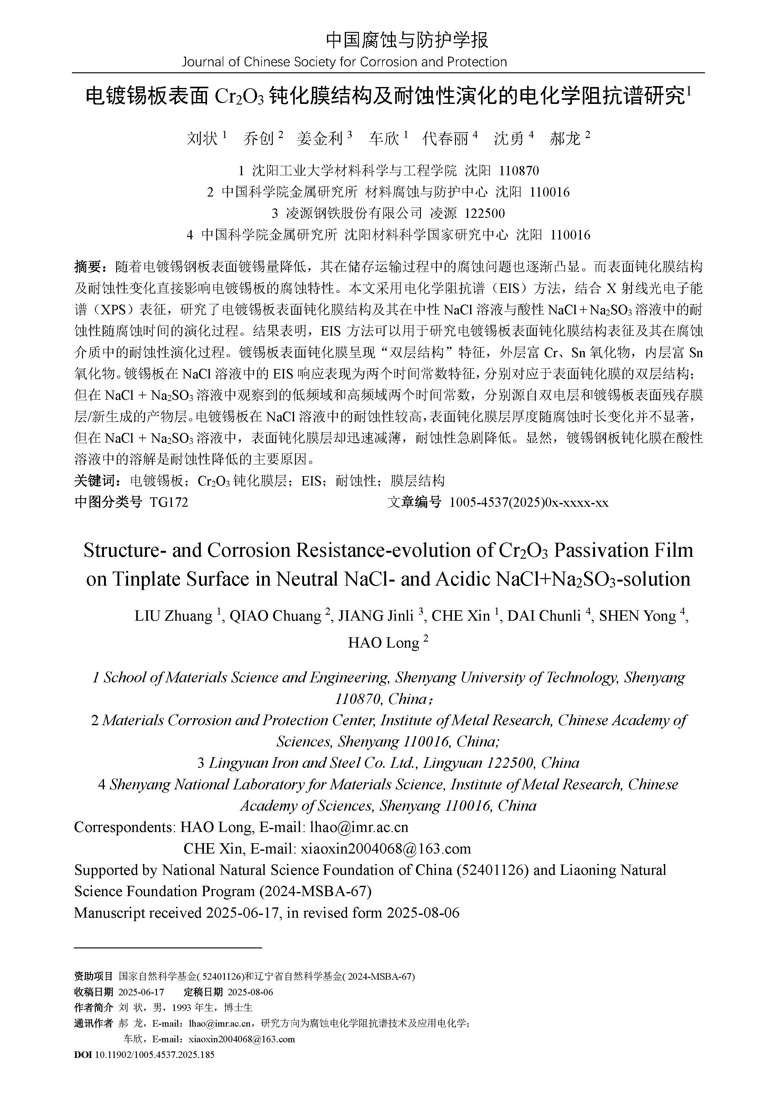 来源:中国腐蚀与防护学报