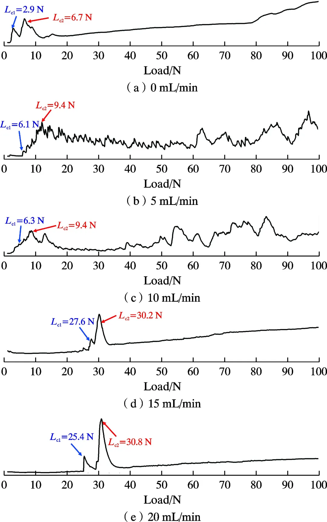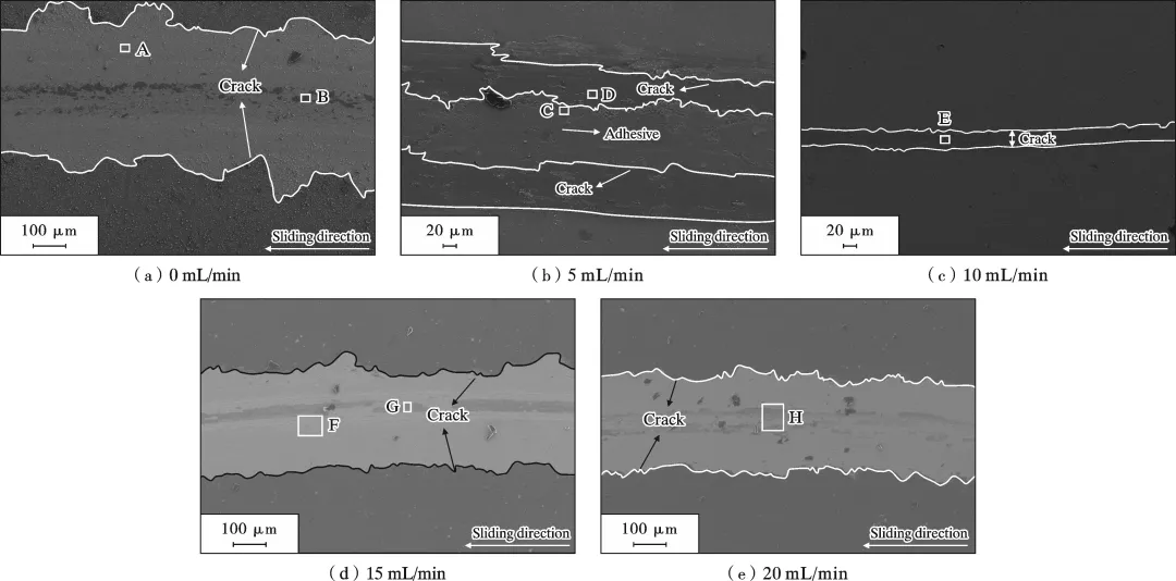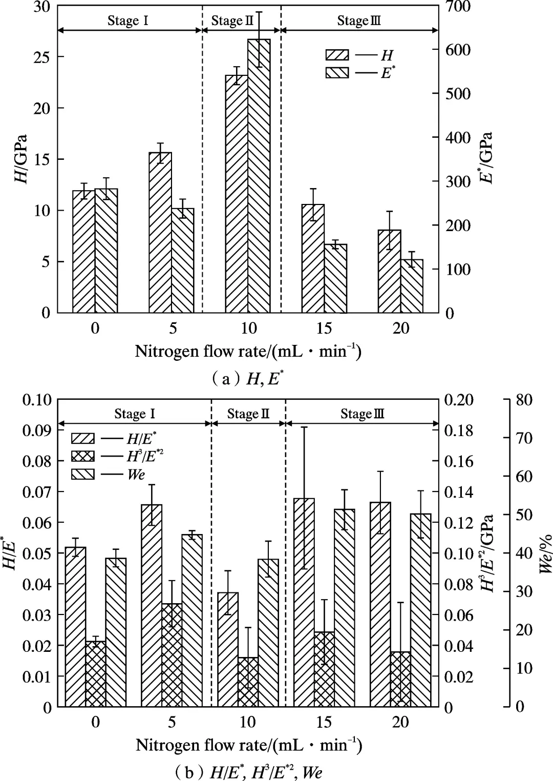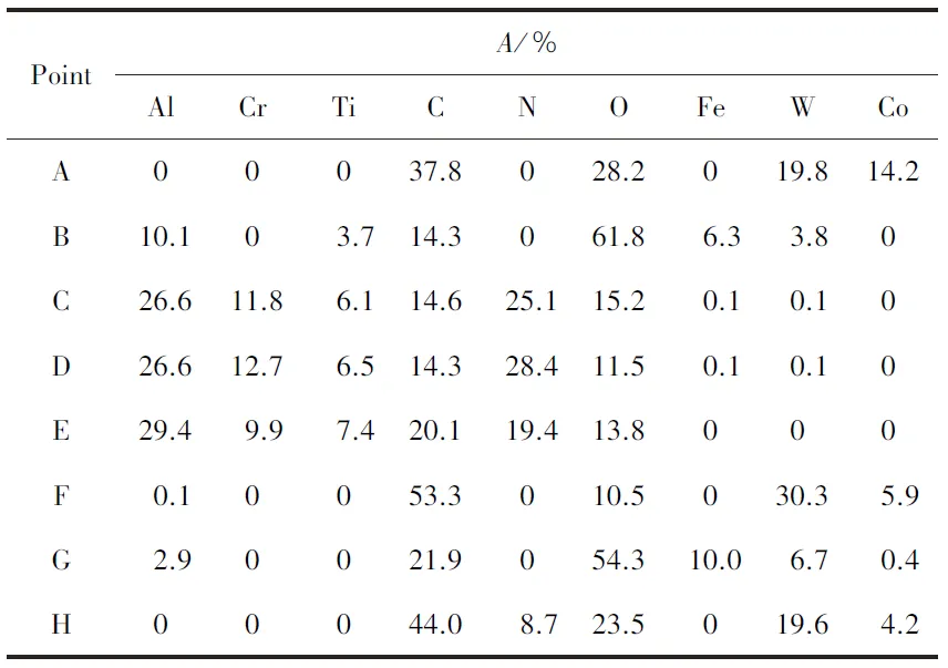 Highlight 1 在N2流量较低时,涂层以低结晶度的纳米复合结构为主,涂层中主要相结构为非晶C相和纯金属相及其碳化物相,表面质量较差,表面缺陷较多, 随着N2流量的增加,涂层逐渐向非晶结构转变,涂层表面质量显著改善。 2 AlCrTiCN涂层的力学性能与涂层中金属元素与非金属元素含量比值密切相关,且表现出明显的区域性。在N2流量为10 mL/min时,涂层硬度和弹性模量分别达到最大值23.1 GPa和622.3 GPa, 主要归因于涂层中氮化物相的增加及固溶强化效应。随着N2流量继续增大,涂层中非晶C相的增多使得涂层硬度下降但韧性增强。涂层结合力随着N2流量的增加逐步提升,在20 mL/min时达到最大值30.8 N。 3 涂层的耐磨性能随N2流量的变化表现出显著差异。N2流量为10 mL/min时,由于其优异的力学性能,涂层拥有最佳耐磨性能,达到最低磨损率为5.7×10-6mm3/(N·m)。在N2流量为0、15、20 mL/min下制备的涂层在磨损试验后均失效而暴露出基体。在N2流量为0 mL/min时,涂层在800 s时发生失效,而在N2流量为15 mL/min和20 mL/min时制备涂层虽然硬度较低,但摩擦系数曲线表明其磨损过程平稳,在磨损过程临近结束时失效。
