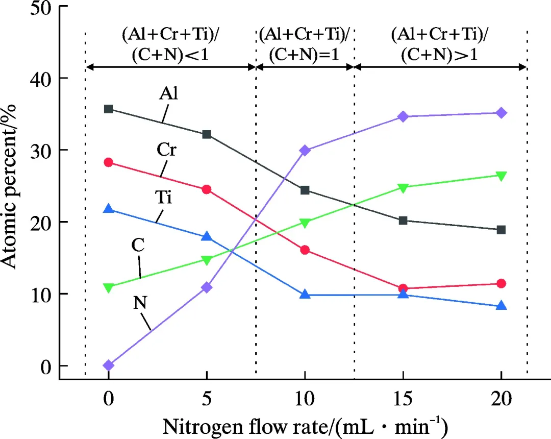 核心观点 采用脉冲直流磁控溅射与射频磁控溅射复合技术,通过调控不同N2流量(0、5、10、15、20 mL/min)制备出5种AlCrTiCN涂层。