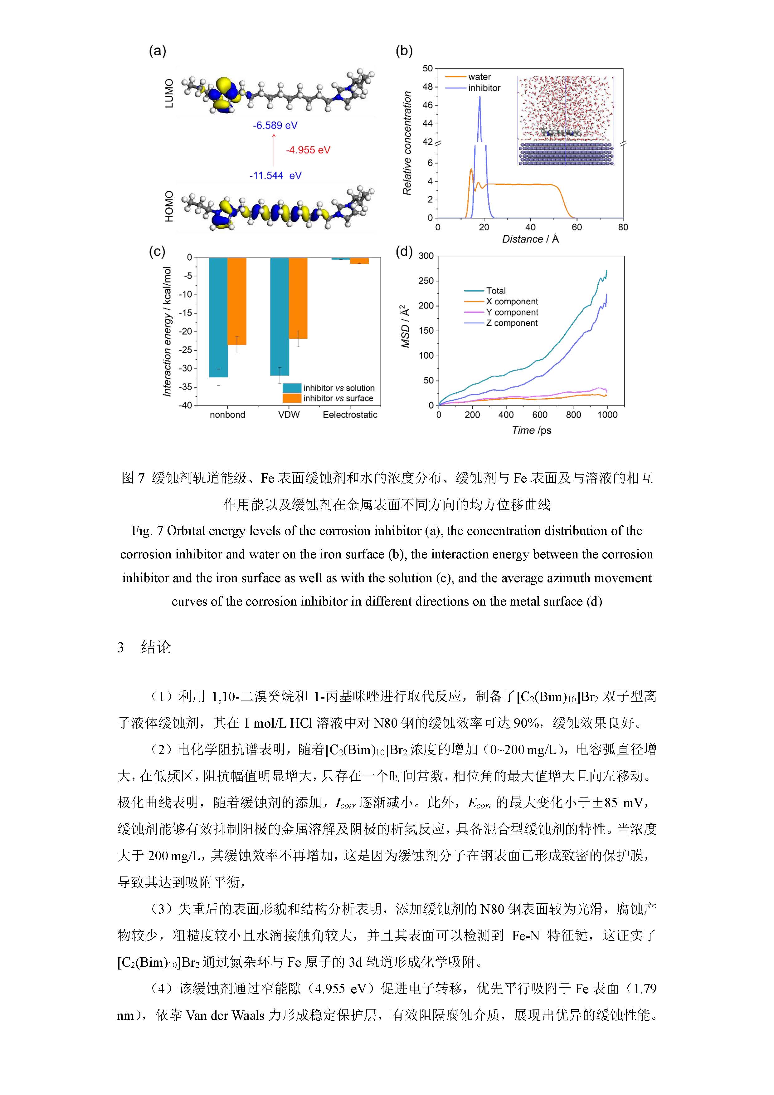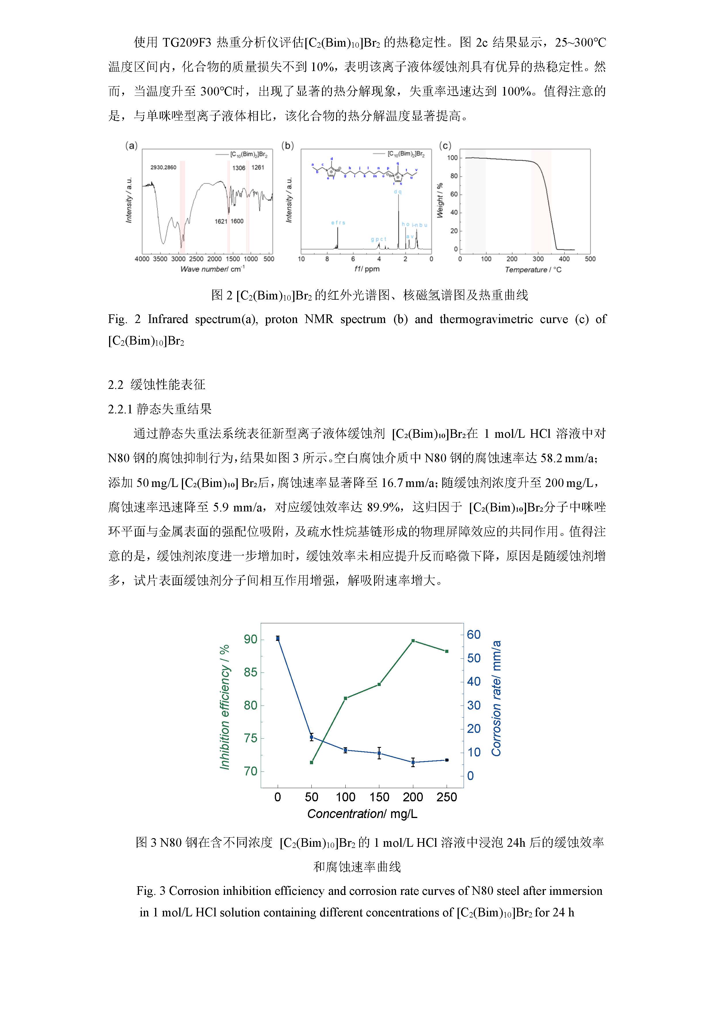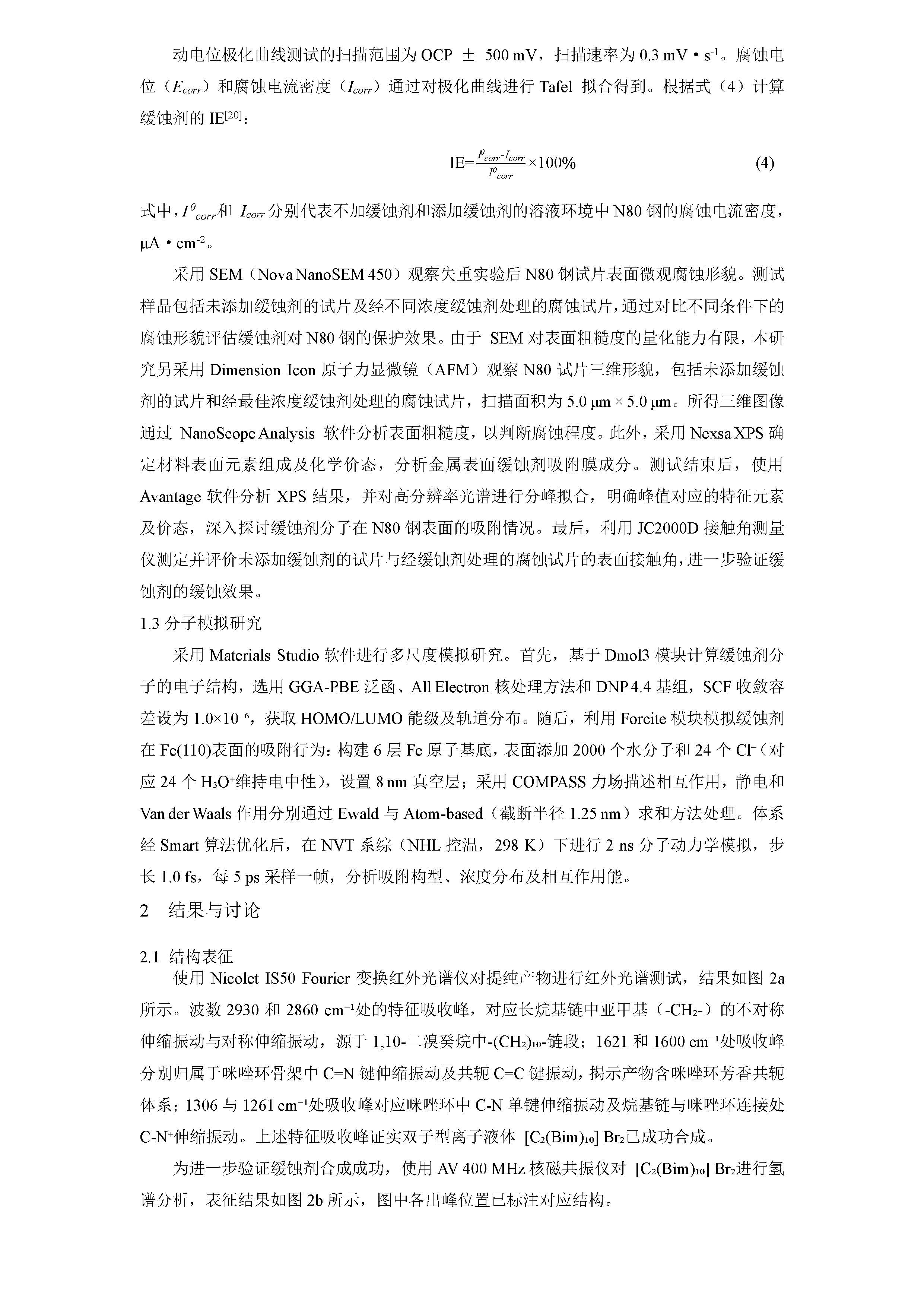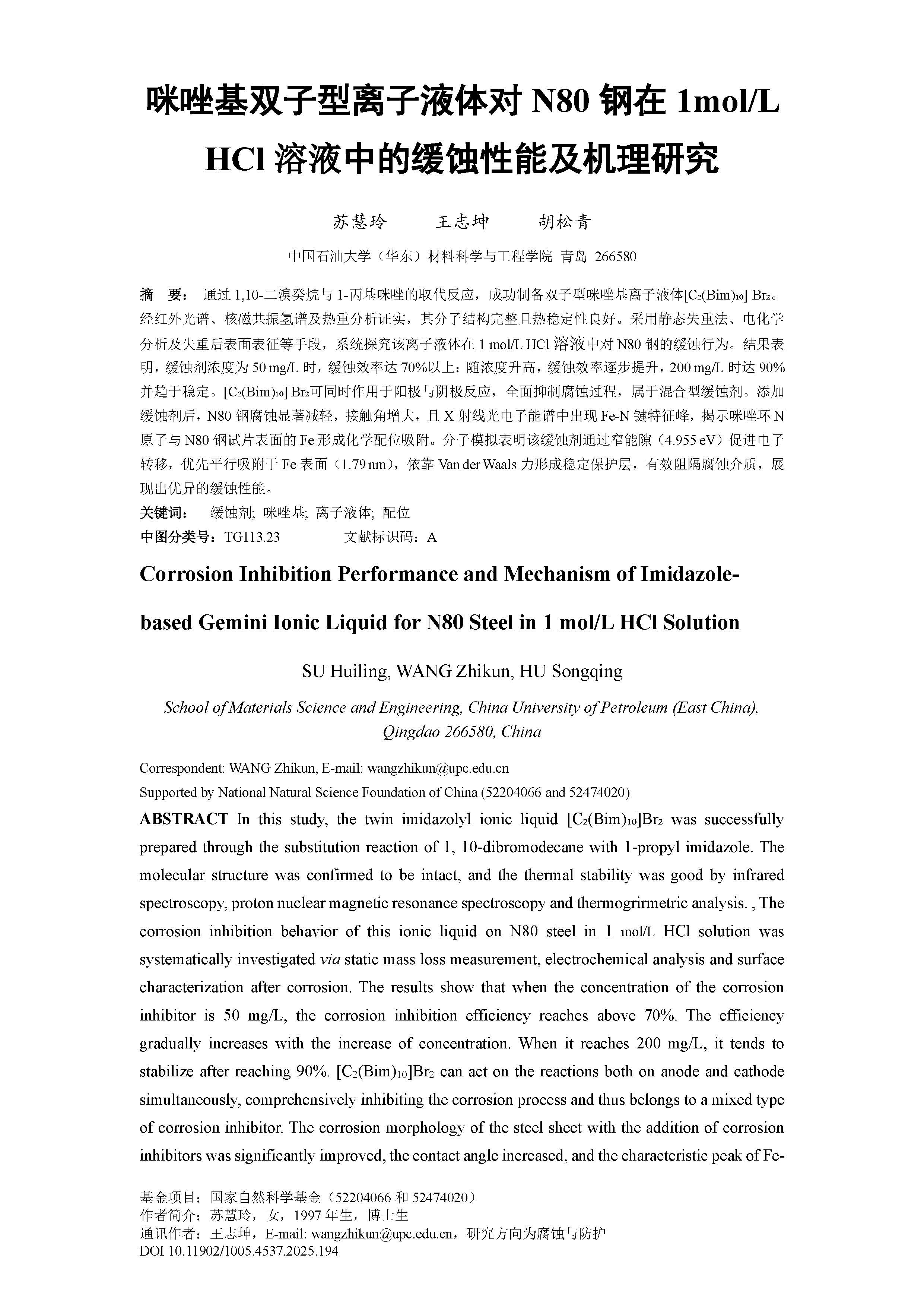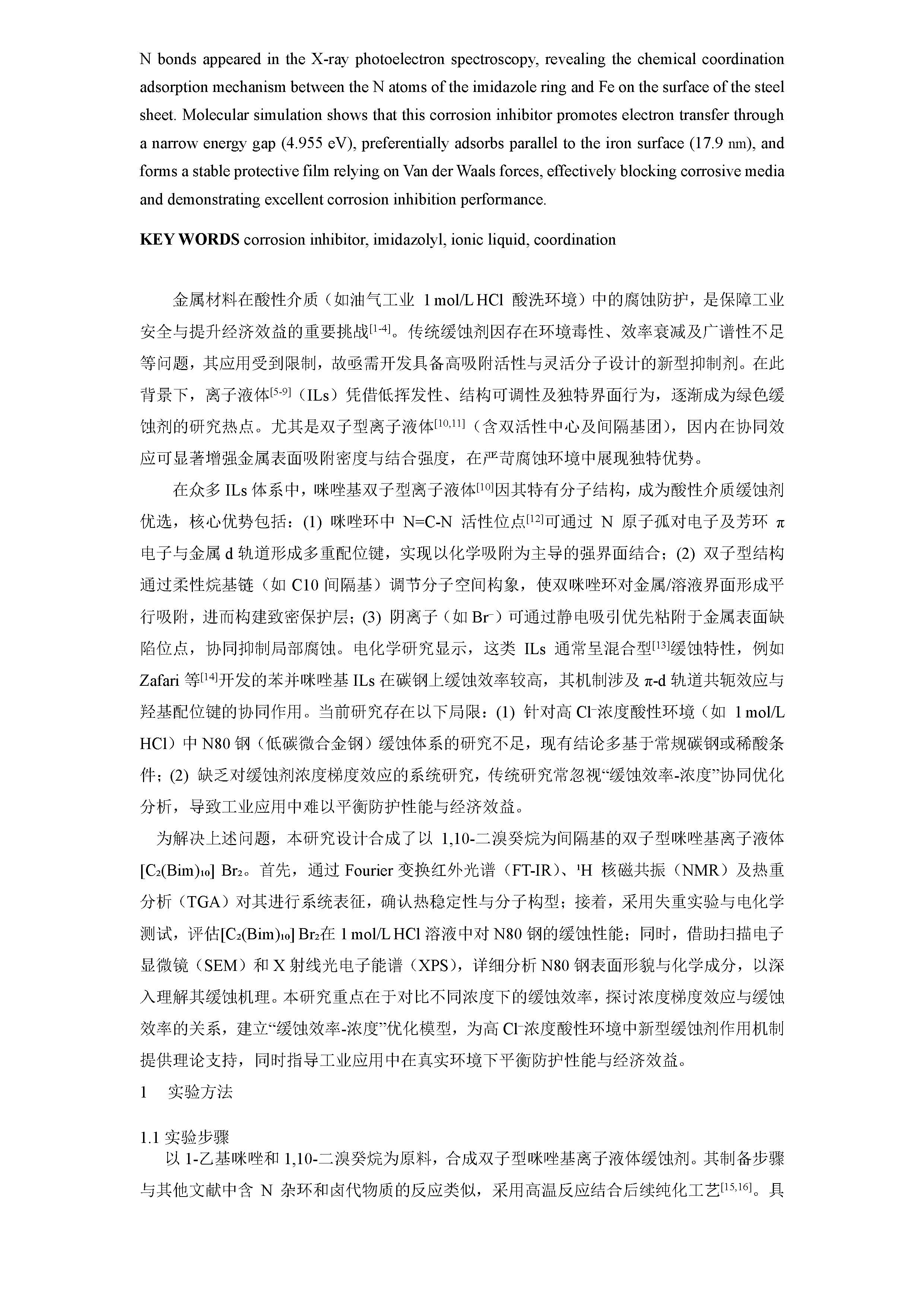 咪唑基双子型离子液体对 N80 钢在 1mol/L HCl 溶液中的缓蚀性能及机理研究