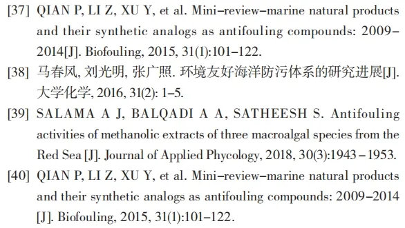 目前从海洋微生物、海藻、海洋无脊椎动物等海洋生物中提取出的防污活性物质,主要包括有机酸、萜类、酚类、吲哚类等[36-38]。例如Salama等[39]在红海内生长的大型藻类体内提取出来具有防污活性的物质,制备涂膜后进行防污试验,结果发现,这种天然产物的提取物具有良好的防污效果,能有效减少污损生物的生长。钱培元等[40]通过研究海洋链霉菌,研发出了丁烯酸内酯类防污剂(Butenolide)。除海洋生物外,陆生植物中也提取出了防污活性物质。例如从辣椒中提取的辣椒素就是一种防污活性物质,具有良好的防污效果。目前,市面上常用的绿色防污剂有2-(对-氯苯基)-3-氰基-4-溴基-5-三氟甲基-吡咯(ECONEA)、4,5-二氯-2-辛基-4-异噻唑啉酮(DCOIT)、吡啶硫酮铜、吡啶硫酮锌以及美托咪啶等。虽然现阶段天然防污活性物质被认为是防污剂的有效替代品,但天然防污活性物质的应用仍面临挑战。首先,生物体内天然防污活性物质含量小,提取难度大;其次,天然防污活性物质的稳定性差,广谱性差等问题使其难以在实际工程中广泛应用。因此,在天然活性物质的基础上,通过化学改性提高稳定性和广谱性或寻求工业化合成是推广仿生防污剂应用的主要途径。