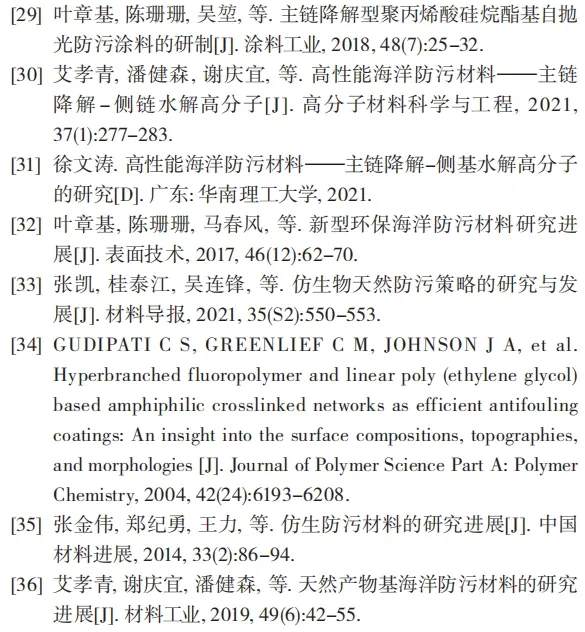 为了改变复配防污剂导致的涂层分布不均和防污剂团聚现象,研究人员考虑将防污剂接枝到树脂上,就可以通过化学方法“水解和扩散”释放防污剂,如此有利于提高防污剂的使用率,避免局部防污剂爆释现象。于良民等[26]制备了一类接枝的功能性丙烯酸锌树脂,浅水挂板试验表明,丙烯酸锌树脂具有良好的物理性能和防污性能。马红圳、谢志鹏等[27-28]通过对苯并异噻唑啉酮进行改性得到羧基,然后将含羧基的苯并异噻唑啉酮接枝到丙烯酸树脂上得到改性的丙烯酸锌树脂,使其侧链具有防污效果。结果表明,苯并异噻唑啉酮接枝丙烯酸锌树脂具有良好的防污性能。由于技术原因,大多数含接枝防污剂的防污材料还处于研究阶段,在实际应用中存在一些困难:由于接枝的防污剂大多需要提前改性,因此往往导致生产工艺复杂和防污剂防污性能的下降,并且在一定程度上提高了生产成本。因此,如何保证防污剂的性能,简化生产过程是未来研究的重点。