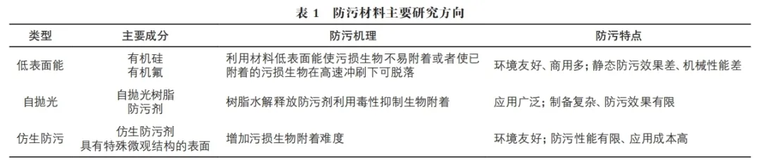 为了防止生物污损的危害,早在木船时期,就采用涂刷沥青、焦油、砷化合物或者包覆铜板等方法作为防污的手段。铁船出现后,由于铜板会加速船体的腐蚀,以往的防污技术已经不再适用,直至有机锡自抛光防污材料作为一种新兴的防污技术开始出现在大众的视野中,由于其具有优良的防污性能,被广泛大量使用[7]。但随着自抛光防污材料使用量的增加,人们逐渐发现有机锡的使用会造成生物富集,且有机锡极难分解,会随着生物链进行转移,对人体健康以及生态环境造成极大的危害。因此《国际管制船舶有害防污系统公约》出台,要求自2008年1月1日起一律禁止船舶使用任何带有有机锡的船舶海洋防污材料。因此,研究新型环保的海洋防污材料已经逐渐发展成为目前我国从事海洋环境防污材料工程相关领域学术研究的一个重要研究热点。表1为目前防污材料的主要研究方向及各类型防污材料的特点。