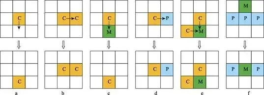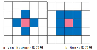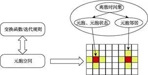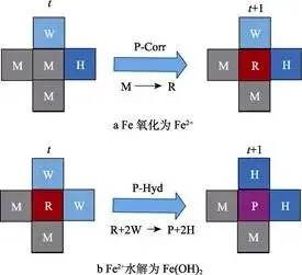 金属材料的腐蚀对国民经济造成了非常严重的损失。据统计,我国每年因腐蚀问题造成的直接财产损失约为2万亿元人民币,约占每年国内生产总值的3%~5%,因此有必要对腐蚀现象进行全面且深入的研究。一般来说,研究人员多采用自然条件原位腐蚀试验方或者试验室加速腐蚀试验法对腐蚀现象进行评估,随着计算机技术的快速发展,数值模拟分析技术也越来越得到广泛关注。相对于试验方法,数值模拟分析具有运算周期短、可重复性强等优点,逐渐在腐蚀损伤表征、腐蚀损伤评估等方面发挥着重要作用,为腐蚀防护提供了有效的技术支持和数据支撑。根据计算原理,对于腐蚀领域的数值模拟分析主要可分为第一性原理计算、数据预测分析和数值建模计算3个方向。 第一性原理计算主要利用薛定谔方程,在晶体尺度上计算环境介质与金属晶体之间的反应。此方法利用量子力学基本理论,能够在原子的尺度量级上研究金属的微观腐蚀机理,但需要超高算力的计算硬件支撑和较精确的实验手段加以佐证,数值模拟周期较长。数据预测分析主要整理金属腐蚀数据,结合机器学习等算法,挖掘金属材料的腐蚀规律。此类方法能够较为直接地预测腐蚀损伤的表征参数变化情况,但无法重现腐蚀介质相互作用过程,对于深入理解腐蚀机理有局限性。数值建模计算主要通过数值模拟计算求解腐蚀过程中的电化学反应,构建扩散方程等,模拟真实的腐蚀动力学过程。元胞自动机模型方法属于数值建模计算中较为广泛应用的腐蚀仿真计算方法,由于其能够直观反映腐蚀电化学反应过程,结合定义的网格状态、演化规则等要素,能够较为精确地模拟腐蚀动力学过程,并对腐蚀机理进行相似复现,受到越来越多腐蚀领域的研究人员的关注。 1 元胞自动机发展历程 20世纪40年代,John von Neumann第一次设计出元胞自动机模型,用于模拟细胞自我复制过程。元胞自动机(Cellular Automata,CA)是一种数值模拟模型的总称,也是一种演化流程框架,此模型通过将实际系统进行元素离散化处理,形成不同状态的元胞,定义域内的元胞会根据演化规则相互作用。Ulam首次定义了“有限元胞自动机”的相关概念,进一步将这一模型进行优化。1970年,Conway运用元胞自动机相关运行机制,设计了名为“生命游戏”计算机游戏程序,通过一定的演化规则模拟简单生命体的成长轨迹,这一游戏程序迅速引起大众对元胞自动机的关注。1983年,Stephen Wolfram发表了关于元胞自动机相关理论模型和实际模拟应用的系统性专著,强调了元胞自动机的建模优势并展望了应用前景。 元胞自动机模型的组成及其相互之间的关系如图1所示。其中,元胞状态、邻居和演化规则是此模型的3种关键组成,元胞状态是指元胞模拟的作用元素及其特性,周边元胞的集合即为元胞邻居,常用的元胞邻居模型有Von Neumann型和Moore型,元胞自动机依据演化规则进行运行。 图1 元胞自动机模型的组成 随着计算机科学的快速发展,元胞自动机的各种理论变体逐步建立,拓展出多种元胞自动机类型,如表1所示。其中应用较为广泛的是二维和三维元胞自动机。 2 元胞自动机分类 2.1 二维元胞自动机 二维元胞空间主要有3种形式,六边形拓扑结构、矩形拓扑结构、三角形拓扑结构,如图2a~c所示。一般来说,较多使用矩形拓扑结构进行腐蚀过程模拟。为了解决初始元胞迭代易产生奇异性问题,引入极角和极径,采用弧底梯形拓扑结构进行蚀坑模拟,如图2d所示。 海洋腐蚀环境中元胞自动机模型主要模拟金属材料在腐蚀溶液中的电化学反应过程。电化学反应方程式可以表示为: 式中:Me代表金属;Me(OH)n表示反应后生成的锈蚀产物。以合金钢材料为例,此过程忽略Fe2O3等非水合物形式的腐蚀产物。为简化模型,根据海洋腐蚀环境下的E-pH图,确定了5种稳定物质,分别为H2O、Fe、Fe2+、H+和Fe(OH)2,元胞代号分别为W、M、R、H、P。元胞自动机的二维空间模型各元胞排列如图3所示。该模型由二维矩形晶格单元组成。初始条件:定义域中的上半部分为腐蚀溶液,下半部分为金属基体,模型中间分布H+元胞单元。边界条件设置为周期性边界。 图2 二维元胞自动机模型拓扑结构划分 图3 二维元胞自动机空间模型各元胞排列 Neumann型邻居主要考虑上下左右方向对于中心单元的影响,而Moore型邻居在上述4个方向的基础上,还需要考虑斜方向单元对于中心单元的影响,如图4所示。 图4 二维元胞自动机邻居类型 海洋腐蚀环境下的二维元胞自动机模型的演化规则一般分为2个模块,分别是腐蚀演化规则模块和元胞扩散规则模块,任意元胞在给定时刻只能展现一种状态。根据电化学反应原理,制定元胞自动机的腐蚀演化规则,如图5所示。 图5 二维元胞自动机腐蚀演化规则 点蚀坑成长受到扩散控制,元胞自动机模型中需要考虑扩散规则的电化学物质分别为Fe2+[P-diffFeII],H+[P-diffH]和Fe(OH)2[P-diffFeHyd],每种电化学物质有相应的扩散概率,如表2所示。上述物质中,Fe(OH)2因为不溶于腐蚀溶液,假设其在重力方向下移的概率大于其他方向移动的概率,将[P-diffFeHyd]引入沉降因子(Sed),实现其扩散的方向控制。 利用元胞自动机模拟合金钢材料均匀腐蚀所得到的纵截面二维表面形貌如图6所示。随着迭代步数增加,金属离子不断溶解,金属表面随机出现无规则的点蚀坑。当步数迭代至2000时,邻近蚀坑有的会发生连通,形成尺度更大的蚀坑