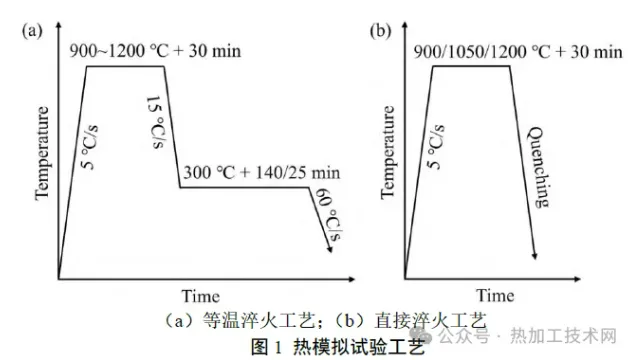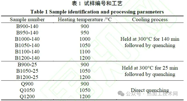 01|试验方案 试验钢为一种高碳合金钢,其化学成分( 质量分数,% ) 为Fe-0.97C-1.62Si-0.33Mn-0.35Mo-1.53Cr-0.98Co-1.14Al 。添加较多硅元素[w(Si)=1.62%]是为了抑制碳化物从奥氏体中析出,添加钴元素可以加速贝氏体相变,铝元素既可以抑制碳化物析出,也可以加速贝氏体相变。试验钢经常规冶炼和轧制后,得到厚度为15mm的热轧板。为了研究贝氏体相变行为,采用DIL 805L 淬火膨胀仪模拟等温贝氏体相变工艺,如图1所示。热膨胀试验的试样从热轧板上切取,尺寸为ɸ4mm×10mm。将试样加热至900、950、1000、1050、1100、1200℃,保温30min,随后以15℃/s 冷却速率冷却至300℃,保温140 min,最后淬火至室温。另外,对于加热温度为900、1050、1200 ℃的试样,额外进行300 ℃保温25 min 并淬火,以及加热后直接淬火[图1 (b)]。所有试样的编号和对应工艺见表1。 热膨胀试验后,对试样进行显微组织检测。采用光学显微镜(optical microscope,OM)和扫描电子显微镜(scanning electron microscope,SEM)观察试样组织形貌。制备碳复型试样,随后采用透射电子显微镜(transmission electron microscope,TEM)观察可能存在的析出相,并进行能谱(energy dispersivespectroscopy,EDS)检测。采用场发射电子探针(electron probe microanalyzer,EPMA)检测试样微区元素分布。此外,采用高温共聚焦显微镜(high-temperature laser scanning confocal microscope,HT-LSCM)观察试样在900℃和1050℃保温时的奥氏体晶粒。