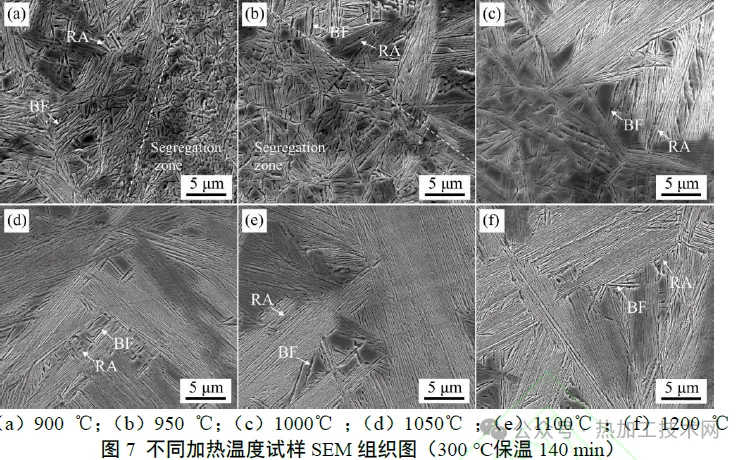 02|试验结果 1 贝氏体相变动力学 B900-140 热模拟试样全程热膨胀曲线如图2所示。 由图2(a)可知,300 ℃之前的冷却过程中热膨胀随温度呈线性变化,即未发生相变。在300℃保温期间,发生贝氏体相变,膨胀量增大。由图2(b)可知,300℃保温后期膨胀量基本不变,说明贝氏体相变达到了最大量。 根据300℃保温期间的热膨胀量,计算贝氏体相变相对动力学,再结合最大转变量获得实际相变动力学,计算公式见式(1),计算结果如图3所示。贝氏体最大转变量根据光学显微镜组织统计得到。 式中:ΔL为300℃保温期间膨胀量实时变化值,μm;ΔLmax为300℃保温期间膨胀量,最大变化值,μm; f为贝氏体实时相含量;fmax为贝氏体最大转变量。 不同加热温度试样贝氏体相变动力学如图3所示。 加热温度为900℃时,贝氏体相变动力学明显快于其他试样,完成5%和50%相变所需时间分别为409s和1104s。加热温度升高至950 ℃后,相变动力学急剧减慢,完成5%和50%相变所需时间分别为1138s 和2374s,延长至900℃的2倍以上。进一步将加热温度升高至1000℃后,相变动力学继续减慢,但减慢趋势明显减缓,完成5%和50%相变所需时间分别为1254s 和2575s。由此可见,随着加热温度升高,贝氏体相变动力学呈减慢趋势,但存在一个临界温度(950℃左右),在该温度之前,相变动力学随温度升高急剧减慢,而该温度之后,相变动力学变化缓慢。 为了进一步验证加热温度对贝氏体相变动力学的影响,选择加热温度为900、1050、1200℃试样进行短时间等温(25min)+淬火实验。贝氏体相变期间膨胀量变化率(ΔL/L0,L0为试样原始长度)如图4 所示。可以看出,在相同加热温度下,短时间保温(25min)和长时间保温 (140min)试样膨胀曲线基本重合,表明试验重复性较好。B900-25、B1050-25、B1200-25试样室温组织如图5所示。由于300℃保温时间较短,贝氏体相变不充分,剩余奥氏体部分转变为马氏体,所以室温组织主要为贝氏体和马氏体,可能存在少量残余奥氏体。经统计可知,B900-25、B1050-25、B1200-25 试样贝氏体相体积分数分别为(78.7±2.0)%、(12±1)%、(11±2)%。上述结果证实了试验钢贝氏体相变速率在较低加热温度下更快,但超过临界温度后,相变动力学变化明显减缓。 2 显微组织 长时间相变试样(140min)室温OM和SEM组织如图6和图7所示。所有试样室温组织主要为贝氏体(B)和残余奥氏体(RA),可能存在少量马氏体(M)。SEM 图像清晰显示出贝氏体铁素体(BF)及相邻BF 之间分布的薄膜状RA。加热温度为900 ℃时[图6(a)],组织中存在明显偏析带,形成了2种形貌和尺寸截然不同的贝氏体区域。结合图6(a)和图7(a)可知,偏析区域的贝氏体板条长度明显较短,厚度较粗。加热温度增加至950℃后,偏析带数量减少,非偏析区域贝氏体束长度增大。加热温度进一步升高至1050℃后,观察不到明显偏析带,贝氏体尺寸分布较为均匀。加热温度为1050~1200℃时,贝氏体形貌和尺寸没有明显变化。此外,对每个试样选取多张OM 组织图统计贝氏体含量,发现加热温度为900、950、1000、1050、1100、1200℃试样贝氏体体积分数分别为(75±2)%、(79±5)%、(82±2)%、(81±3)%、(80±3)%、(83±2)%。随着加热温度升高,贝氏体含量先升高,后变化不大。