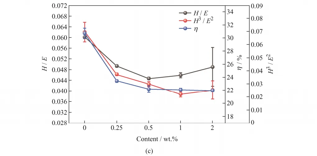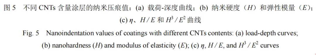 CNTs 的添加降低了涂层的硬度,且随着含量增加,涂层的硬度降低,CNTs 为 0.25wt.%涂层的显微硬度为 1 024.55 HV0.2,添加 0.5wt.%的CNTs 使涂层的弹性模量增加了约 17.9 GPa。