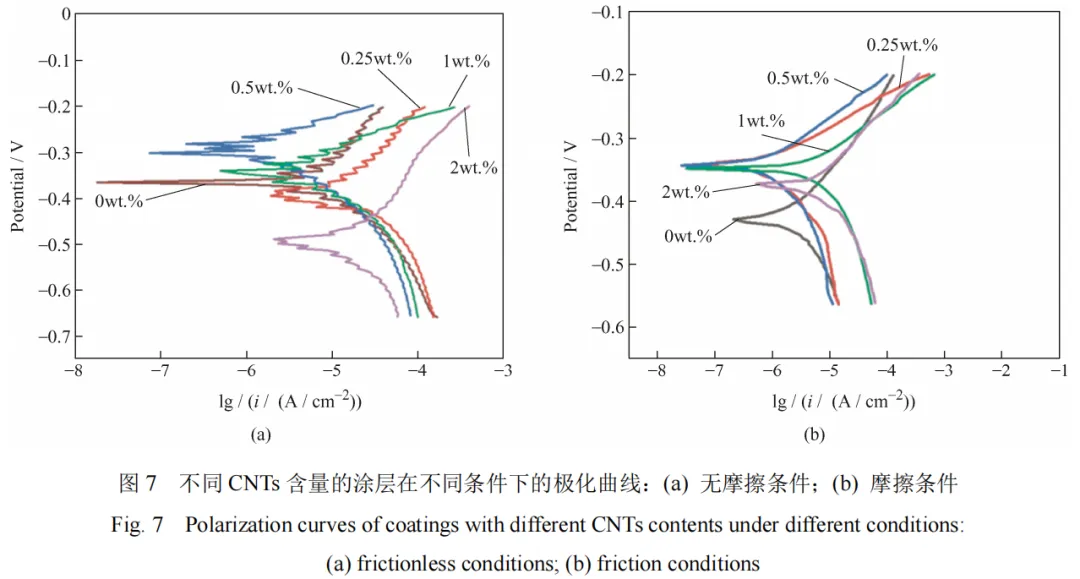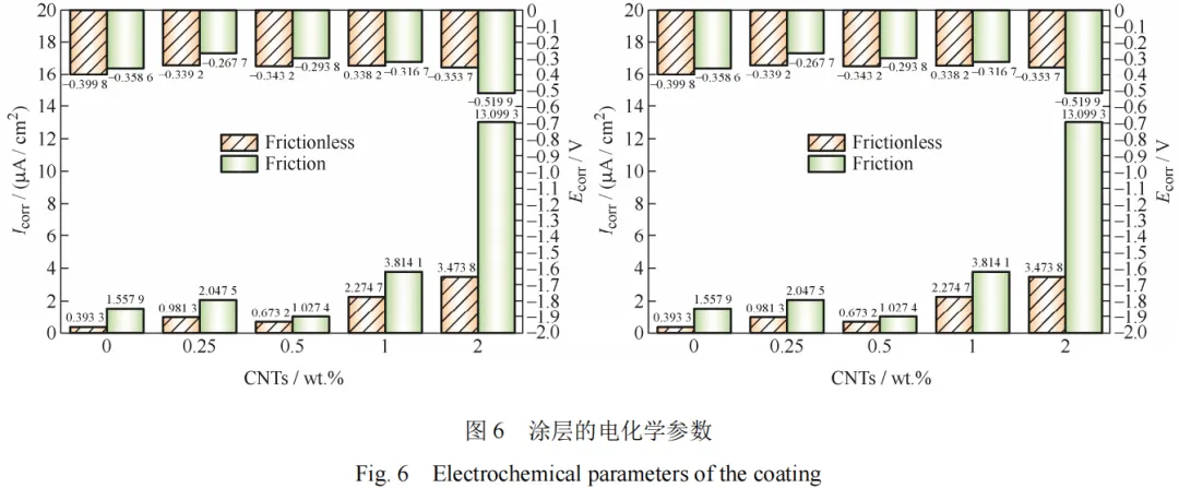 CNTs 的添加没有改变涂层在磨损-腐蚀交互作用下材料的损耗行为,但 0.5wt.%的 CNTs 可提升涂层摩擦磨损条件下的耐腐蚀性能。未添加 CNTs涂层的腐蚀电位和电流密度分别为-0.358 6 V 和1.557 9 µA / cm2,CNTs 含量为 0.5wt.%涂层的腐蚀电位和电流密度分别为-0.293 8 V 和 1.027 4 µA /cm2。添加 CNTs 涂层的磨蚀损耗行为以腐蚀对磨损的促进作用为主。