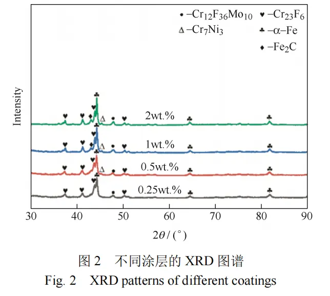 CNTs 的添加促进了涂层的结晶,且随着CNTs 含量的增加,涂层的非晶含量减少。不同 CNTs含量涂层均存在 α-Fe 固溶体、Cr23C6 硬质相和Cr12Fe36Mo10 金属间化合物,当 CNTs 含量大于0.25wt.%,涂层中开始出现 Cr7Ni3,当 CNTs 含量大于 0.5wt.%,涂层中产生了 Fe2C。