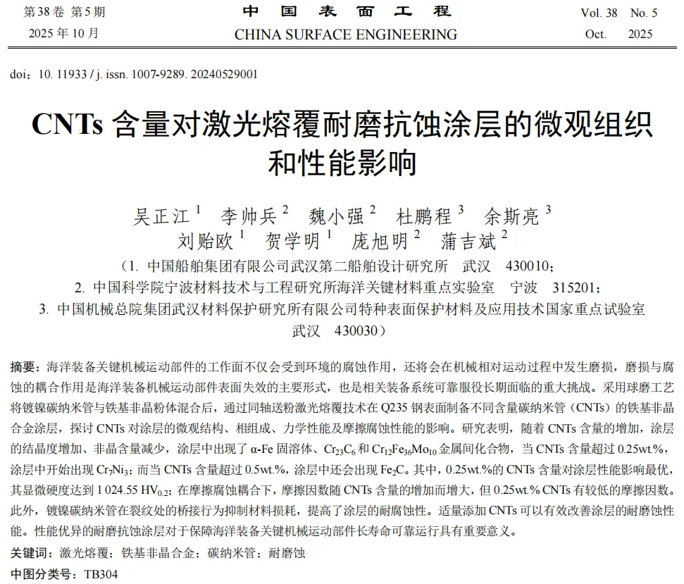 中国科学院宁波材料技术与工程研究所蒲吉斌研究员团队在《中国表面工程》2025年第38卷第5期发表研究论文《CNTs含量对激光熔覆耐磨抗蚀涂层的微观组性能影响》,采用球磨工艺将镀镍碳纳米管与铁基非晶粉体混合后,通过同轴送粉激光熔覆技术在 Q235 钢表面制备不同含量碳纳米管(CNTs)的铁基非晶合金涂层,探讨 CNTs 对涂层的微观结构、相组成、力学性能及摩擦腐蚀性能的影响。