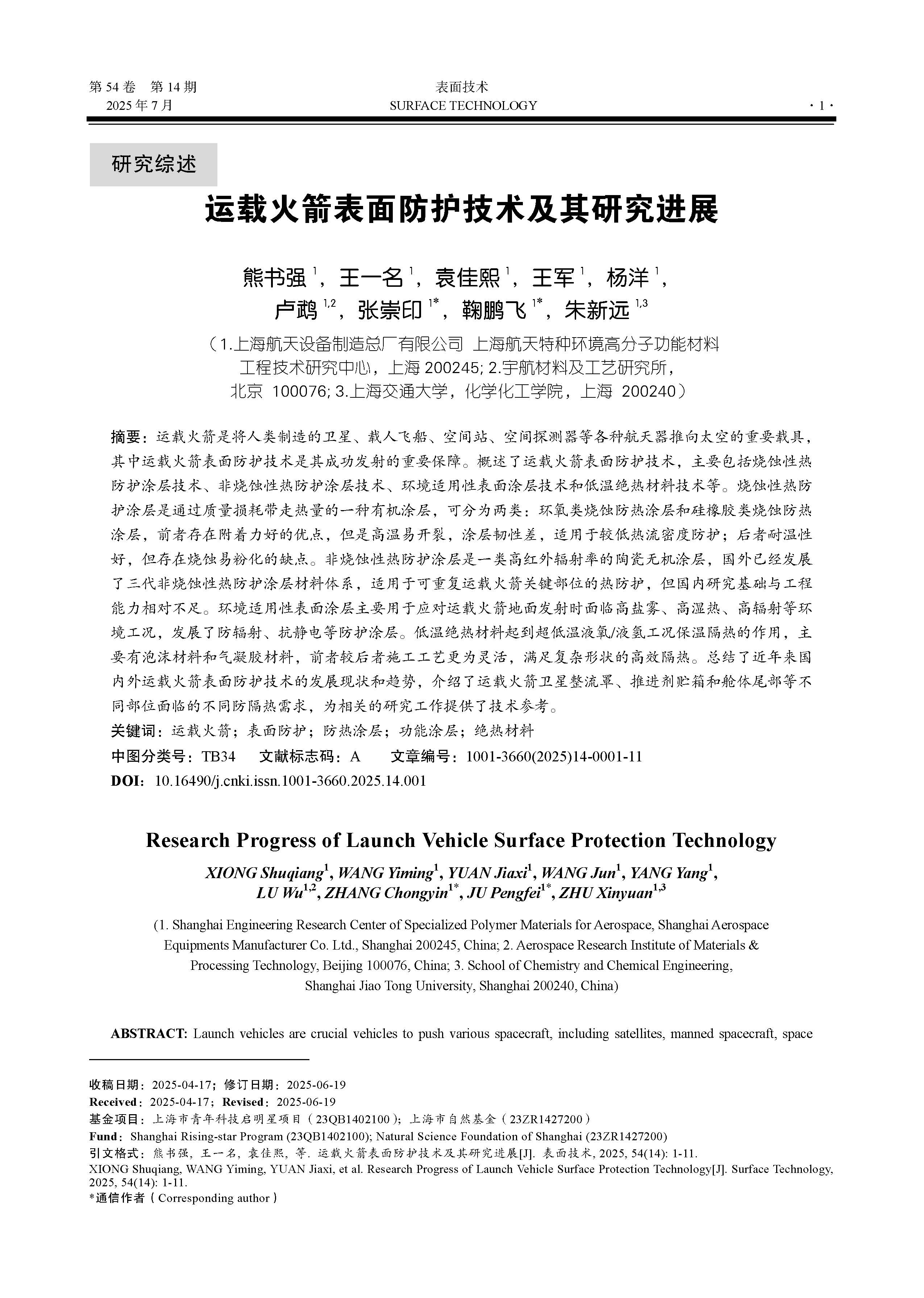 鞠鹏飞研究员团队:运载火箭表面防护技术及其研究