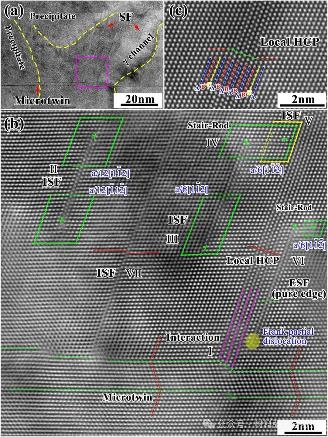 当蠕变应变进一步发展至约1.0%时,γ通道内部层错密度显著升高,多组层错在同一区域内发生复杂交互。研究清晰观察到ISF-ISF以及ISF-ESF之间的反应过程,局部区域形成类 Lomer-Cottrell锁结构,显著提高了位错运动阻力。同时,在特定几何条件下,三条部分位错协同作用形成宏观形变为零的孪晶结构,即所谓“零应变孪晶”。此外,连续层错的叠加在局部诱发FCC→HCP类相变,进一步增强了γ通道内平面缺陷网络的结构稳定性,从而有效延缓蠕变损伤的累积。