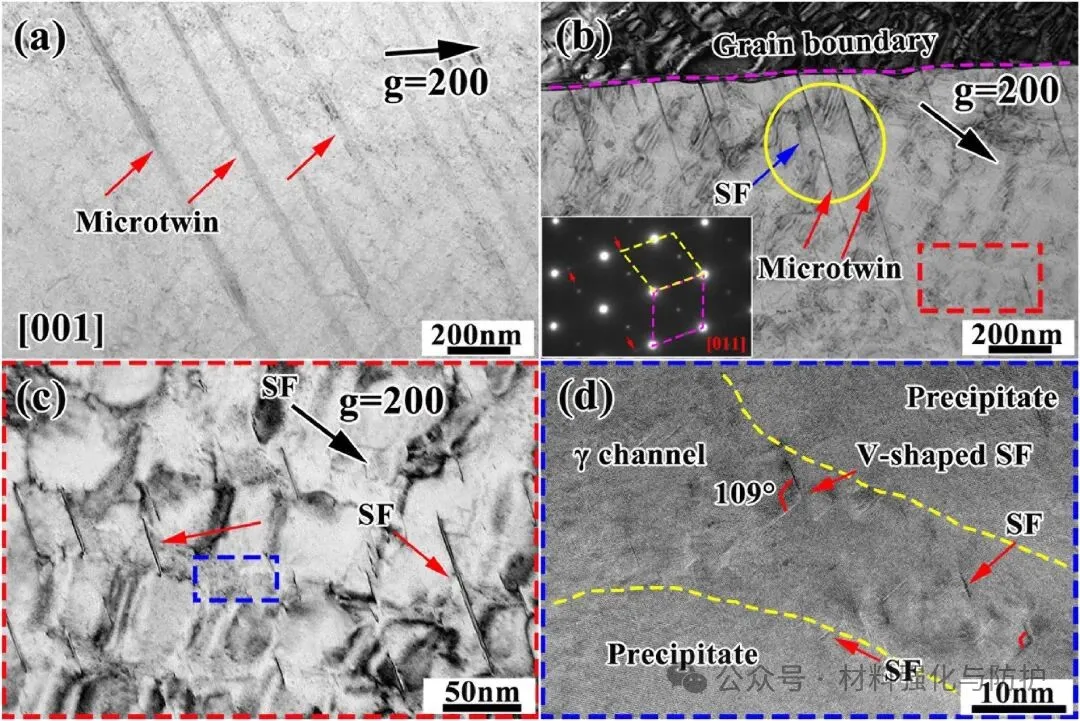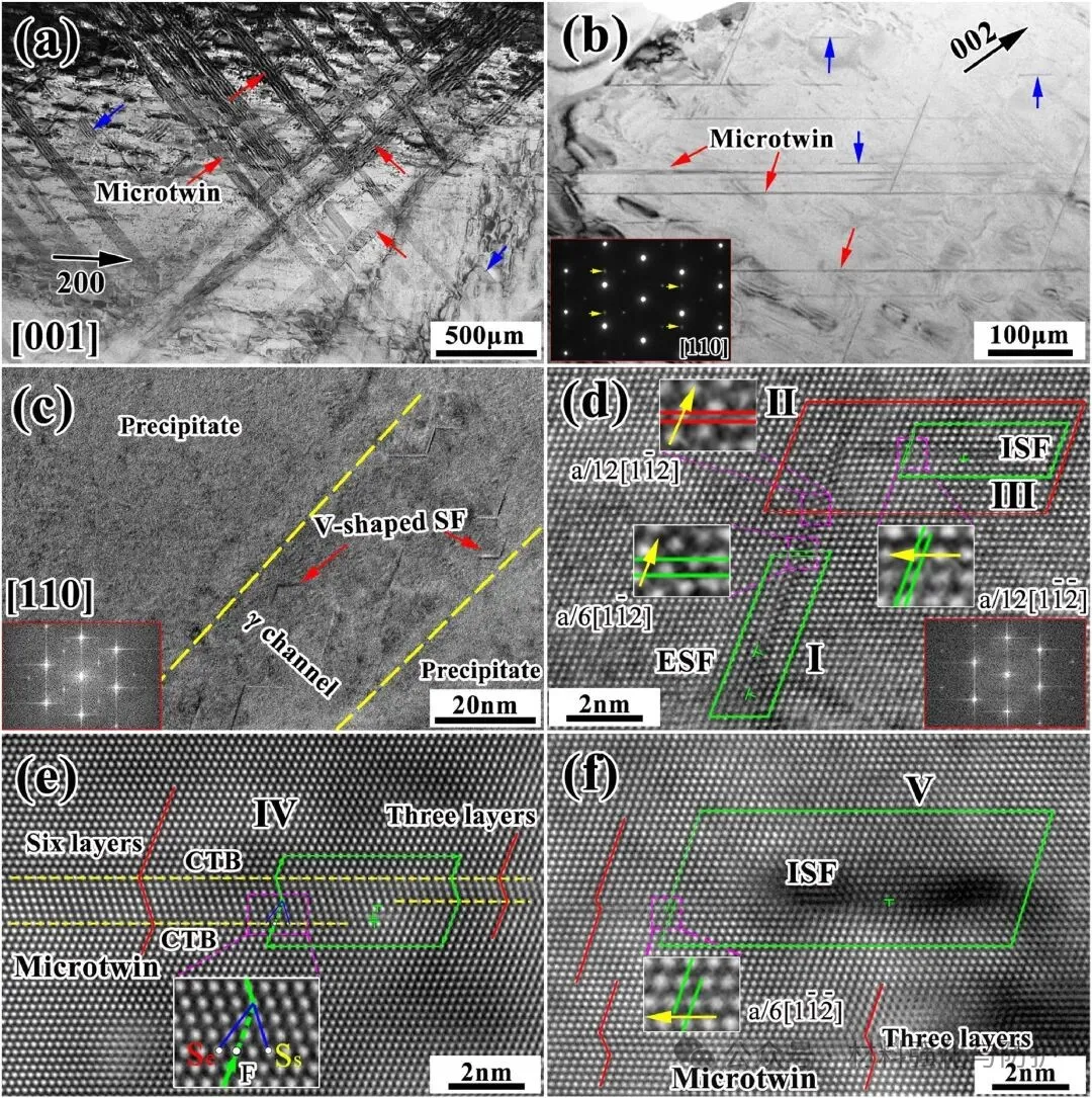 ③ γ通道内V形层错与γ'相微孪晶的协同演化