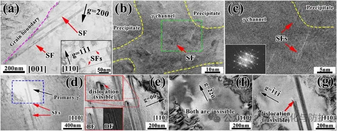 在0.1%应变的蠕变初期,塑性变形首先集中于γ通道内部,受低层错能特性影响,γ基体中的全位错易发生解离,并在{111}面上诱发层错结构,这些层错宽度可达5-10nm,且能够在不发生明显阻碍的情况下穿越γ/γ'界面。相较于γ'相内部,γ通道是中温蠕变条件下平面缺陷的首要激活区域,其在早期变形阶段即对蠕变行为产生决定性影响。