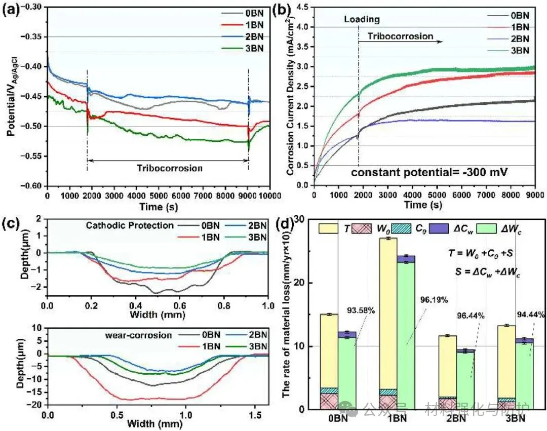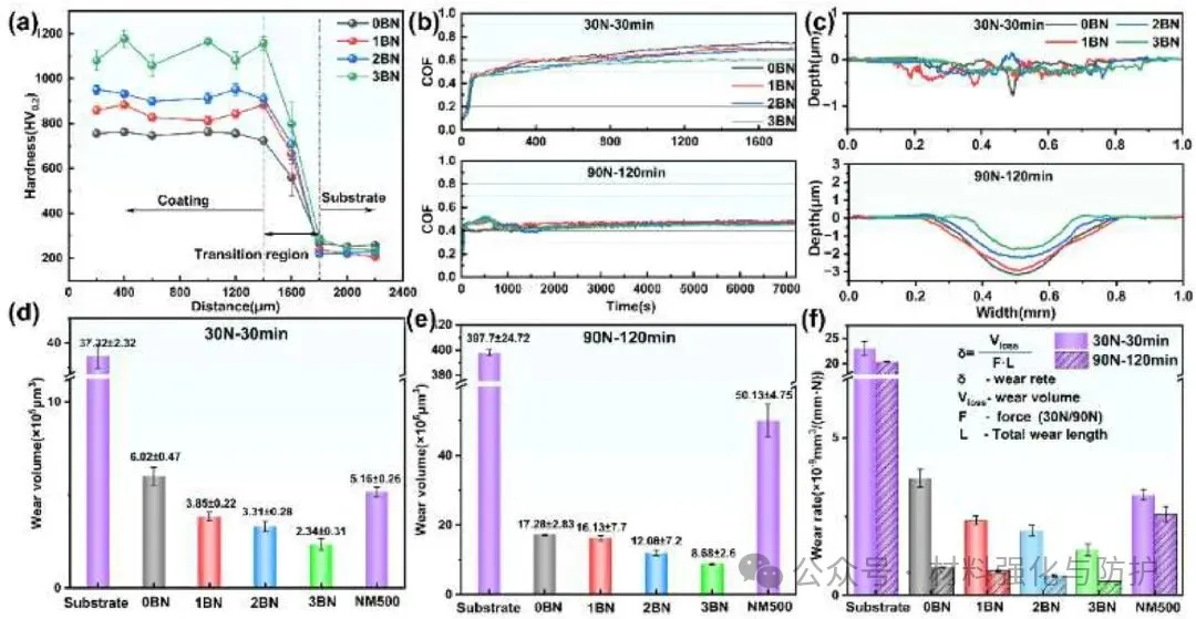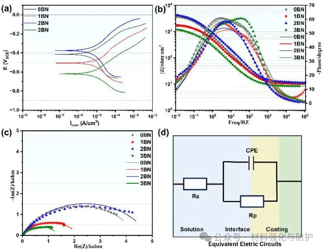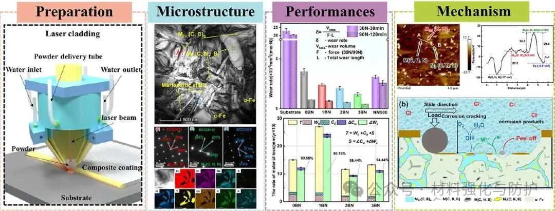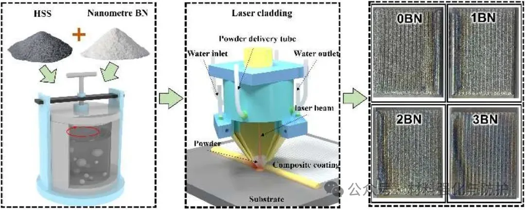 团队将合金成分为:2.03 wt.%C、4.23 wt.%Cr、6.48 wt.%Mo、6.52 wt.%W、6.25 wt.%V、4.45 wt.%Co的高速钢粉末颗粒与由纯度99.8%的纳米BN颗粒组成的BN粉末在200rpm的球磨机中混合4h,使纳米BN颗粒均匀地附着在球形HSS粉末表面,共设计了四种不同BN含量(0、1、2和3wt.%)的样品,分别命名为0BN、10BN、20BN和30BN。采用激光熔覆技术在普通碳钢(Q355)表面制备了HSS/BN复合涂层。针对制备完成的样品团队结合XRD与SEM/EDS分析相组成并表征显微组织与元素分布,通过显微硬度测试与干滑动磨损实验评估耐磨性能;以动电位极化曲线与电化学阻抗谱(EIS)系统表征样品的腐蚀行为,系统性的以结构-性能-机制的多尺度关联分析为核心,深入揭示第二相调控规律。