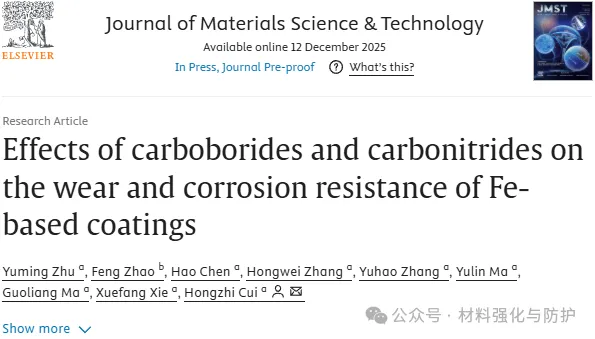 该研究从第二相类型与分布调控的角度,系统揭示了碳硼化物与碳氮化物在铁基涂层中的协同强化机制,这一成果为高服役环境下铁基涂层的成分设计与组织调控提供了清晰的材料学思路,对工程应用具有重要指导意义。