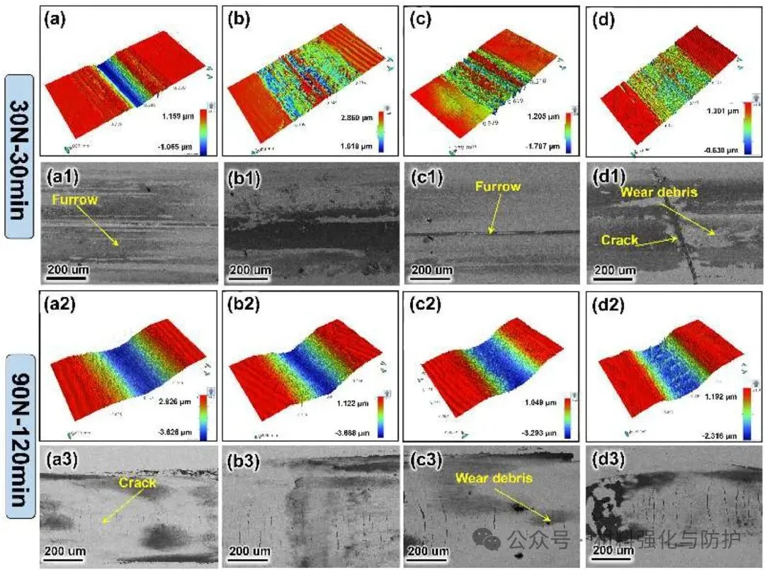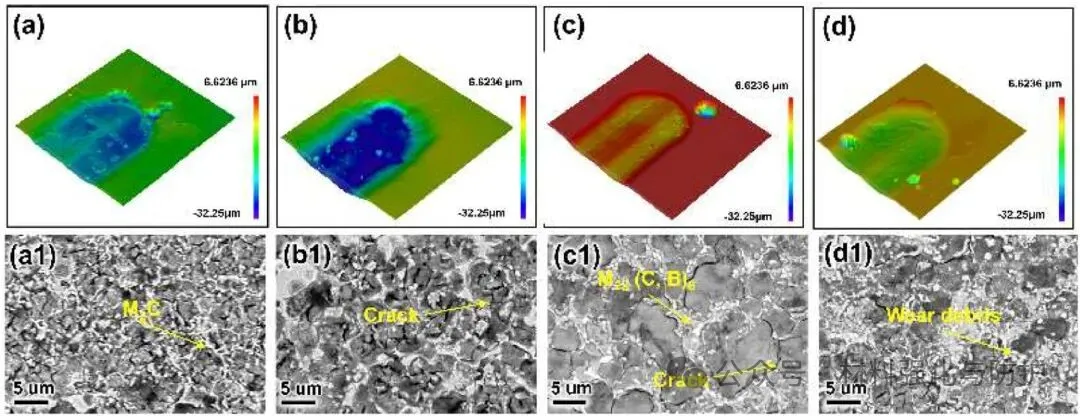随着碳硼化物和碳氮化物含量的增加,涂层整体硬度呈现出提升趋势,这种硬度增强并非单纯依赖于硬质相含量增加,而是源于细小弥散硬质相与基体之间的协同变形与载荷分担机制,磨损实验结果进一步验证了这一点,涂层的磨损率明显降低,显示出优异的抗磨损能力。复合陶瓷相的引入改变了涂层的磨损失效模式,相比未优化组织的涂层,复合强化涂层表面犁沟深度明显减小,材料剥落现象受到有效抑制,磨损机制由以严重犁削和局部剥落为主,逐步转变为以轻微磨粒磨损为主。