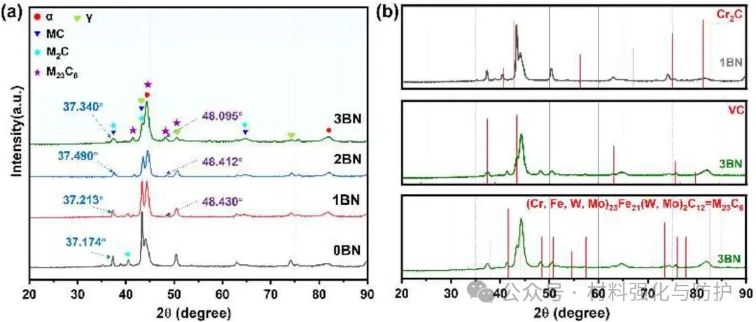 随着BN添加量的增加,铁基涂层由单一碳化物体系逐步演化为包含碳硼化物与碳氮化物在内的复合陶瓷相体系,这些新生成的复合相并非简单的元素叠加,而是B、N原子参与晶格形成后稳定存在于硬质相结构中,且该复合陶瓷相是在熔池内原位反应生成,为后续组织调控和性能协同提供了稳定的相组成基础。
