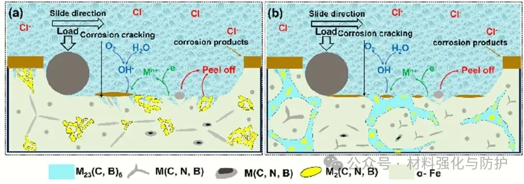 在磨损-腐蚀耦合服役条件下,研究发现复合碳硼化物与碳氮化物相通过降低局部电化学不均匀性与增强结构完整性,有效削弱了磨损与腐蚀之间的相互促进作用,硬质相的稳定存在抑制了磨损诱导的腐蚀扩展,而均匀组织又降低了腐蚀对磨损失效的加速效应,从机理层面实现了耐磨性与耐蚀性的协同提升。