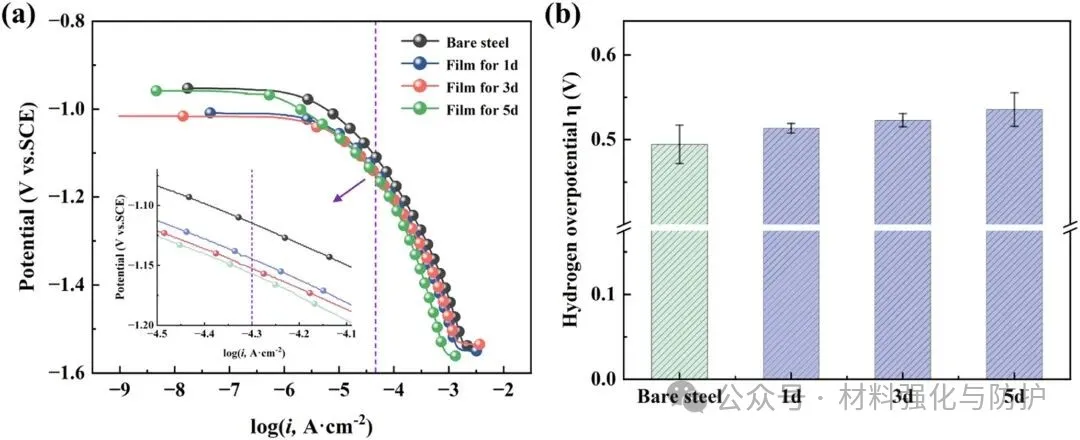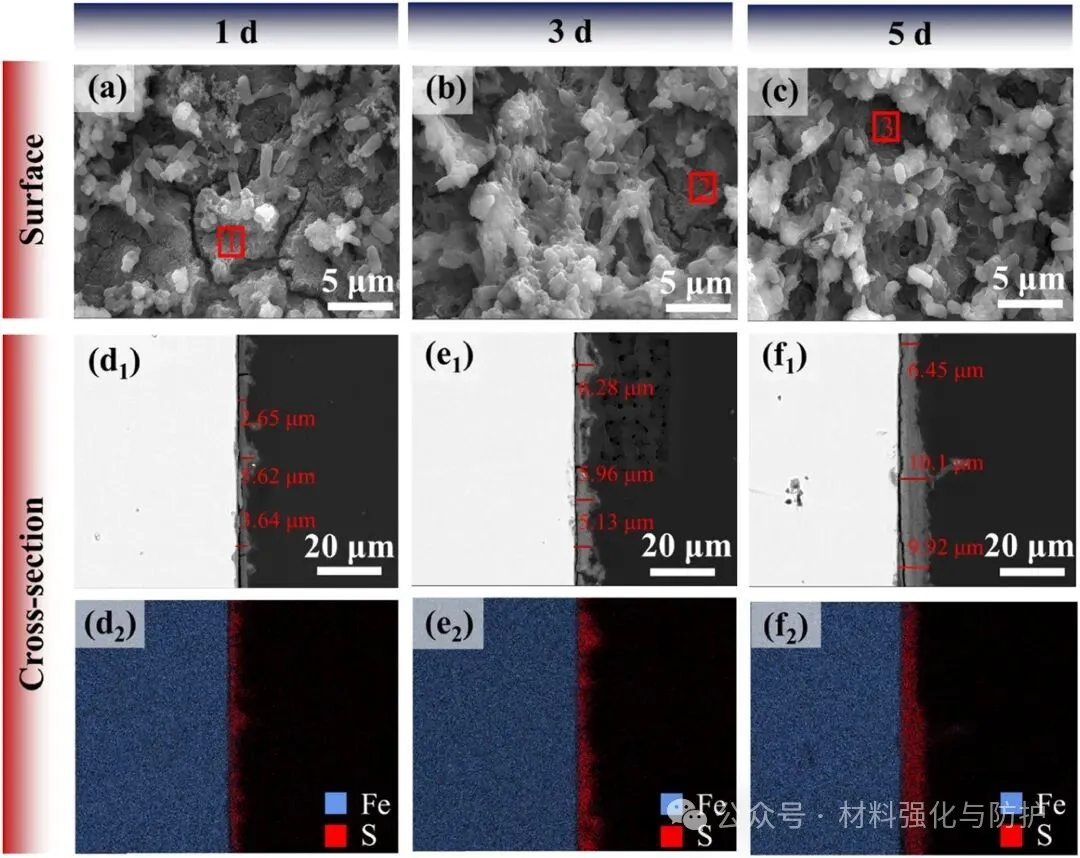 在SRB作用下,钢表面逐渐形成以FeS为主的腐蚀产物层,该腐蚀层改变了金属/溶液界面的电化学反应特征:一方面,FeS及生物膜的存在增强了局部阴极反应活性,促进氢析出过程;另一方面,其非均匀分布导致界面电化学条件高度局部化,为腐蚀坑的形成和后续裂纹萌生提供了有利条件。