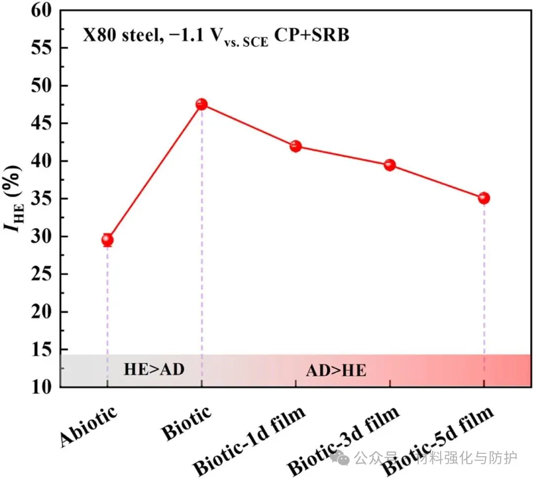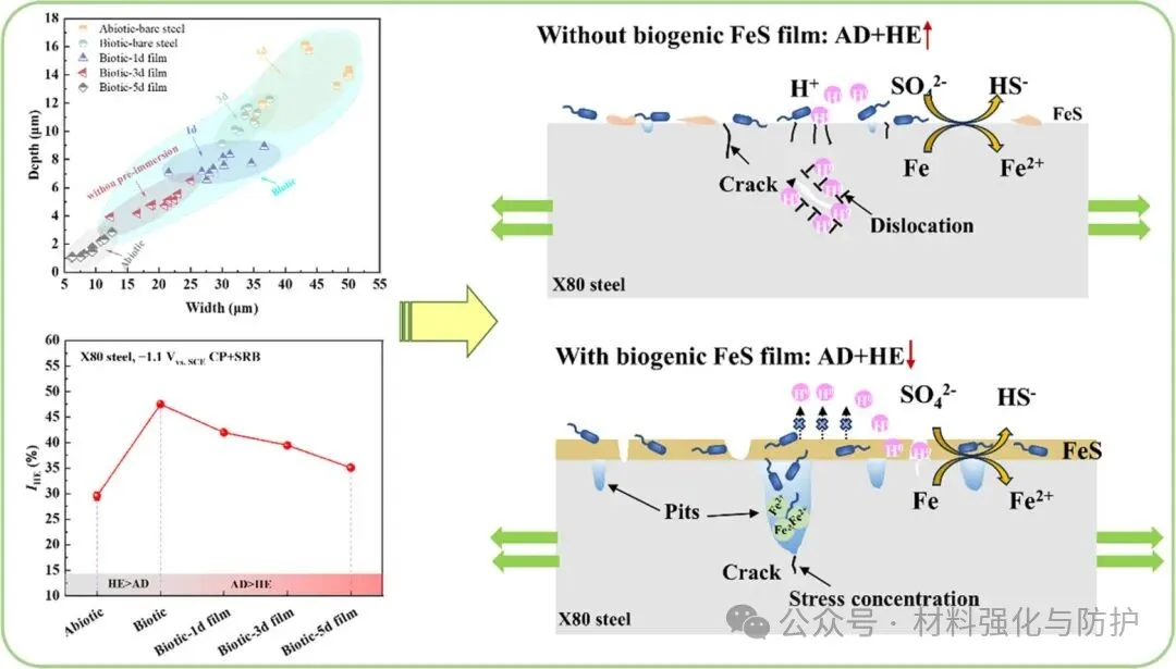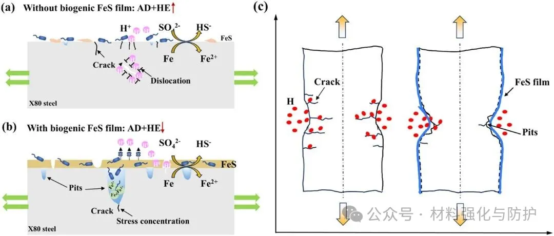 SRB的代谢活动促进了阴极反应动力学,加快了原子氢在钢表面的生成与吸附过程,生成的氢原子在高应力区、晶界及位错等微观缺陷处富集,降低了局部结合强度并削弱材料的承载能力,氢致脆化效应与局部腐蚀过程相互耦合,是导致裂纹快速扩展和材料提前失效的重要内在机制。