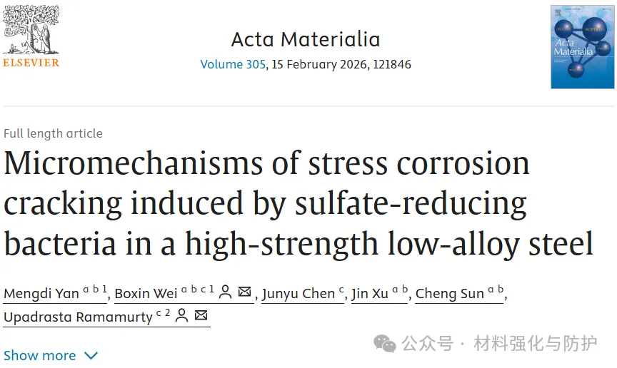 中科院金属所联合中国科学技术大学与新加坡南洋理工大学于2025年12月18日在腐蚀领域的国际期刊《Acta Materialia》在线发表了题为“Micromechanisms of stress corrosion cracking induced by sulfate-reducing bacteria in a high-strength low-alloy steel”的研究论文,该论文的工作系统揭示了硫酸盐还原菌(SRB)参与条件下,高强低合金钢发生应力腐蚀开裂(SCC)的微观起源与演化机制。研究从电化学行为-腐蚀产物-氢行为-裂纹扩展路径的多尺度角度,阐明了微生物活动如何显著加速高强钢的灾难性失效,为服役于海洋、油气与地下环境中的结构钢安全评估提供了重要理论依据。论文的通讯作者为中科院金属所韦博鑫副研究员和南洋理工大学的Upadrasta Ramamurty教授。