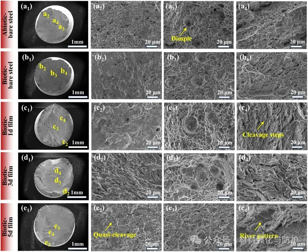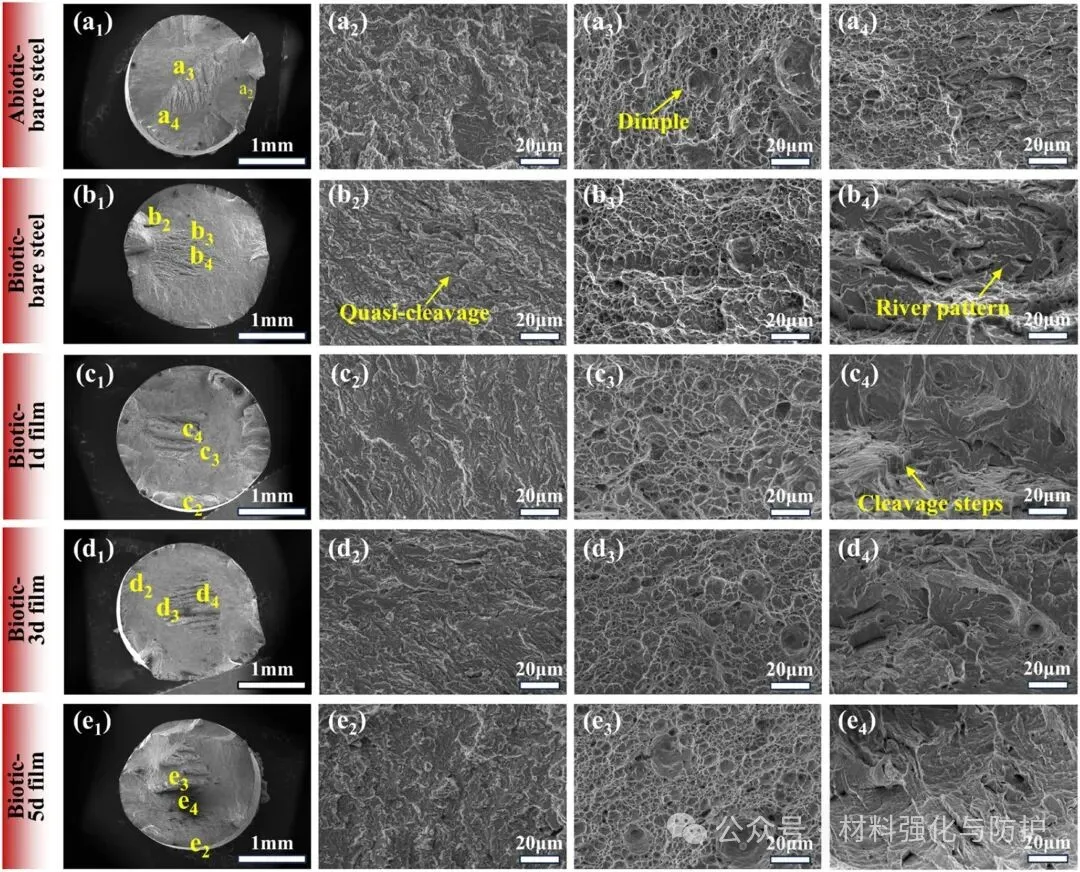 SSRT结果清晰表明,在硫酸盐还原菌(SRB)参与的腐蚀环境中,与无菌环境相比,试样的断裂时间明显缩短,断后伸长率显著降低,表明材料的塑性变形能力受到严重抑制,材料在弹塑性转变后迅速进入失稳断裂阶段。