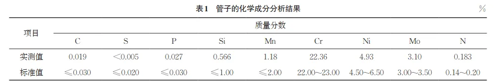 使用电感耦合等离子体原子发射光谱法对管子的化学成分进行分析,结果如表1所示。由表1可知:管子的化学成分满足GB/T 21833—2008《奥氏体-铁素体双相不锈钢无缝钢管》的要求。