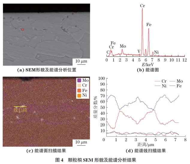 对管材内壁的白色颗粒相进行SEM观察及能谱分析,结果如图4所示。由图4可知:颗粒相分布于晶界和晶粒内,主要分布在铁素体、铁素体和奥氏体交界位置,颗粒相中Cr、Mo元素含量均明显高于基体,其分布位置和元素含量均符合σ相特征;基体中存在较多富Cr元素的颗粒状σ相,发现σ相的Cr元素含量明显高于基体,但σ相周围Cr元素含量明显降低,形成一定范围的贫Cr区,降低了材料的耐腐蚀性。