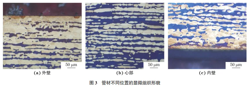 管材不同位置的显微组织形貌如图3 所示。由图3可知:管材显微组织为奥氏体+铁素体,但不同位置的相含量有所差异;管材心部奥氏体的体积分数为48%,符合GB/T 21833.1—2020《奥氏体-铁素体型双相不锈钢无缝钢管 第1 部分:热交换器用管》的要求;管材内、外表面附近的奥氏体含量明显高于铁素体,其中内壁奥氏体的体积分数约为61%,外壁奥氏体的体积分数约为65%,在内、外壁表层的组织中发现较多的白色颗粒相。