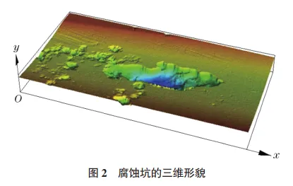 使用激光共聚焦显微镜对管材腐蚀位置进行观察,腐蚀坑的三维形貌如图2所示。由图2可知:在最大腐蚀坑靠近中间位置发生腐蚀穿孔,该位置的腐蚀坑深度最深,在最大腐蚀坑周围分布有较多小腐蚀坑,小腐蚀坑的深度较浅。