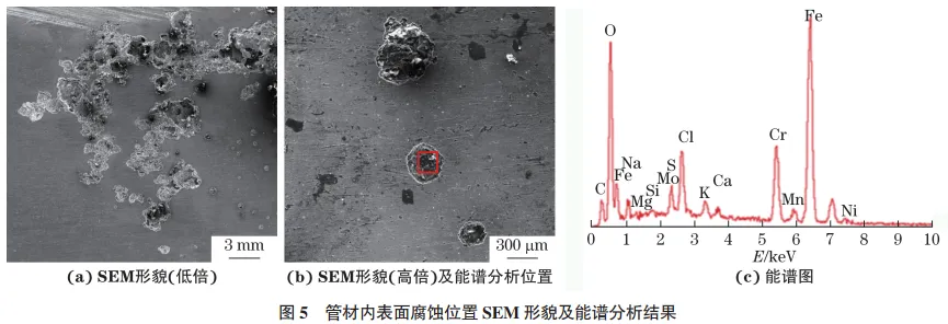 管材内表面腐蚀位置SEM形貌及能谱分析结果如图5所示。由图5可知:腐蚀位置呈不规则的凹坑状,部分腐蚀坑连接成片,部分腐蚀坑单个独立分布,腐蚀坑内有腐蚀产物残留;坑内腐蚀产物中有少量腐蚀性Cl元素和S元素。