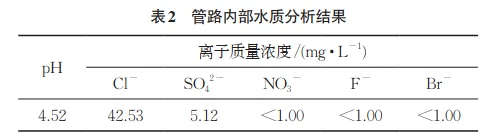 使用离子色谱仪对管路内部水质进行分析,结果如表2所示。由表2可知:管内水的pH为4.52,呈酸性,并含有氯离子和硫酸根离子,其余阴离子含量较少。