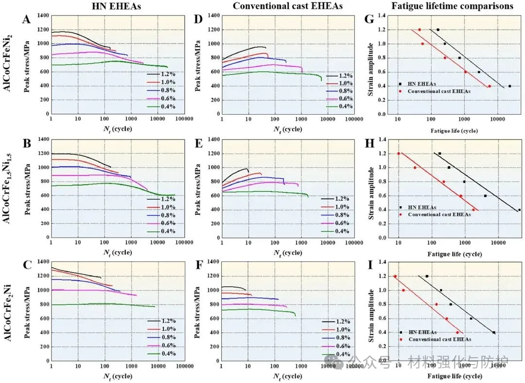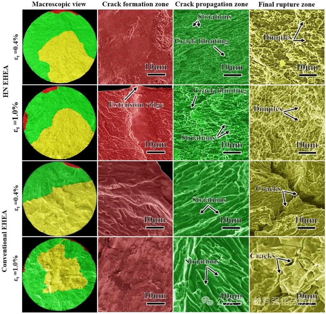 Fe和Ni掺杂的合金展现出较高的疲劳寿命,这是因为多尺度的异质结构在循环变形过程中能够诱导形成稳定的位错梯度分布,降低局部应变集中的程度,从而抑制疲劳裂纹的早期萌生,从断口形貌与裂纹扩展路径的分析也可以发现,多尺度异质组织能够有效干扰裂纹的连续扩展,裂纹在不同尺度相区与异质界面处发生偏转、钝化甚至分叉,使裂纹扩展路径显著延长,并伴随更多塑性能量耗散,从而降低裂纹扩展速率。