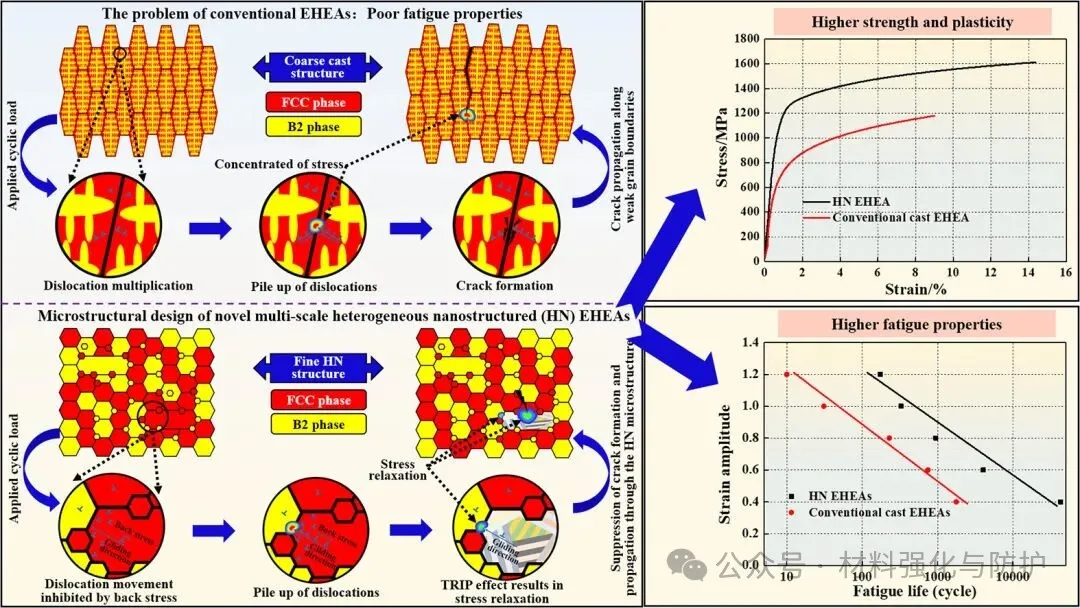 研究通过在共晶高熵合金中引入多尺度异质纳米结构,成功实现了超高强度与卓越疲劳性能的协同提升,研究揭示了异质组织、位错梯度与裂纹扩展行为之间的内在关联,适用于航空航天、海洋工程及高端装备等对疲劳可靠性要求极高的应用场景。