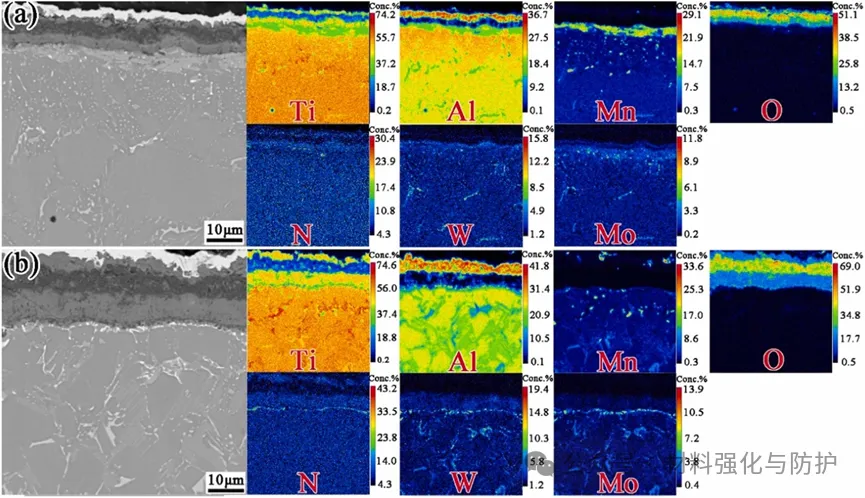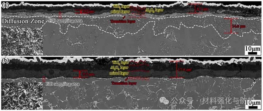 TMMW合金在750°C、3000小时等温氧化后,具有(a)NL结构和(b)EQ结构的TMMW合金横截面形态EPMA-BSE图像