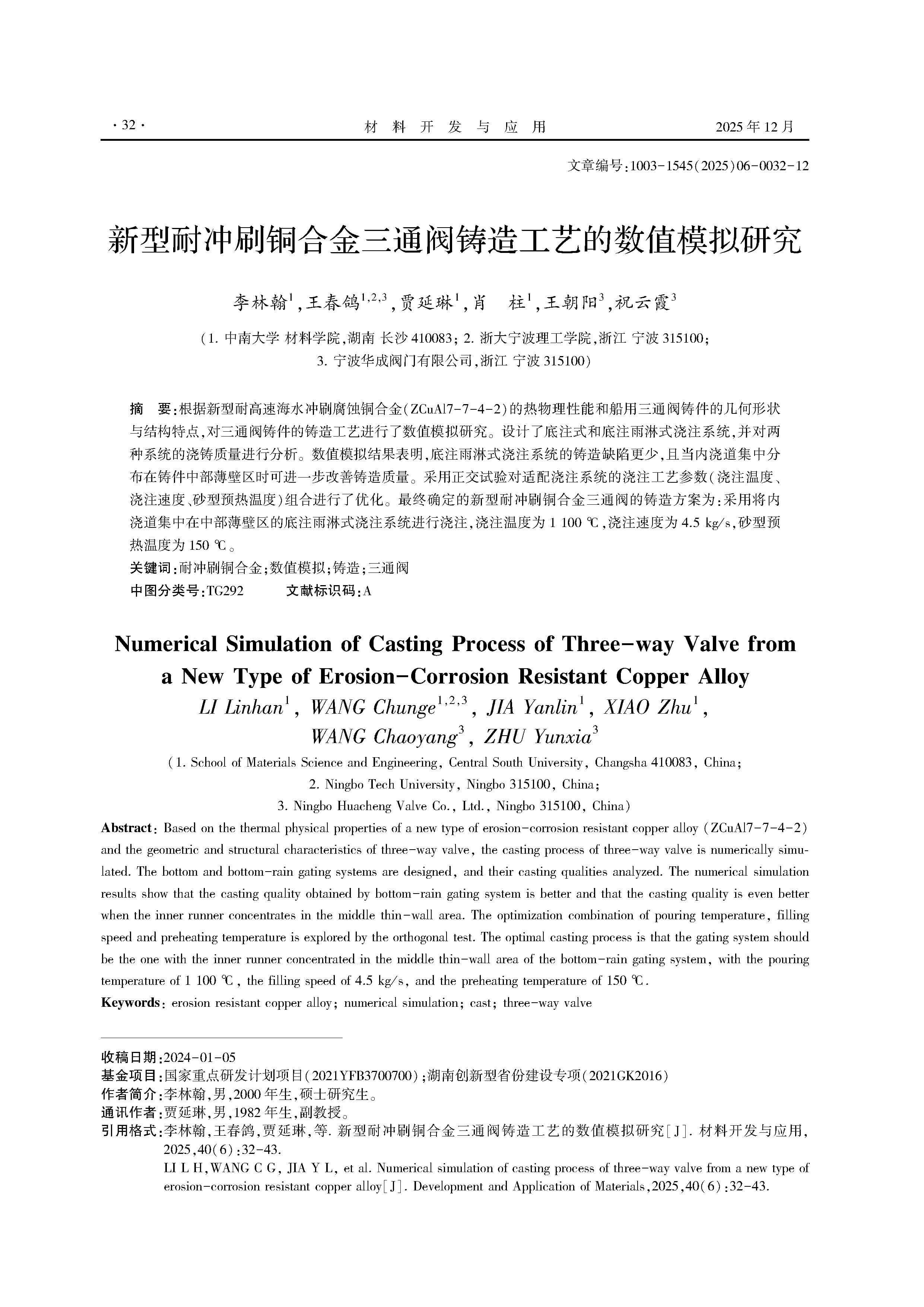 新型耐冲刷铜合金三通阀铸造工艺的数值模拟研究