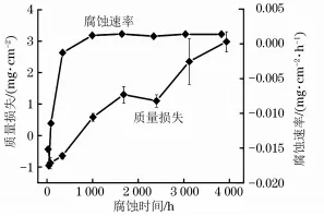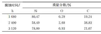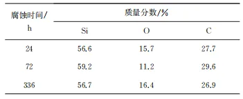 采用循环水化学试验系统对SiC/SiCf复合材料包壳管进行耐水侧腐蚀性能测试。试验条件模拟压水堆一回路水化学环境,溶液为含1200mg/LH3BO3和2mg/LLiOH的高纯去离子水溶液,溶解氧质量浓度为5μg/L,试验温度为(360±1) ℃,压力 为(20±0.5) MPa。 试样为SiC/SiCf复合材料包壳管(外径10mm、 内径8mm、长20mm) 。SiC/SiCf复合材料包壳管整体为三层结构:内层为致密的CVD-SiC层,中间层为SiC纤维编织层,外层为CVD-SiC涂层。其中,SiC纤维编织层(中间层) 采用化学气相渗透法(CVI)制备,填补了SiC/SiCf复合材料间的空隙。 使用金刚石金相砂纸和抛光液对试样截面进行打磨和抛光,随后用自来水冲洗试样5min,去除表面磨抛残留物后,再用去离子水冲洗5min,待试样干燥后放入乙醇中超声清洗 20min并烘干。腐蚀试验前,使用游标卡尺及千分尺测量试样尺寸并计算表面积,采用精度为0.01mg的电子分析天平称量,计算试样腐蚀前后的质量损失及腐蚀速率。 SiC/SiCf复合材料包壳管腐蚀试验的总时长为164天。试样腐蚀不同时间(0,24,72,336,1008,1680,2400,3120,3936h)后取出,并进行观察、表征和称量。采用扫描电子显微镜(SEM)对试样的表面及截面形貌进行观察,采用能量色散谱仪(EDS)对其成分进行分析,根据式(1)计算试样的腐蚀速率。 式中:v为试样的腐蚀速率,mg/(cm2·h);m前为试验前试样的质量,mg;m后试验后试样总质量,mg; S为试样的表面积,cm2 ;t为试验时间,h。