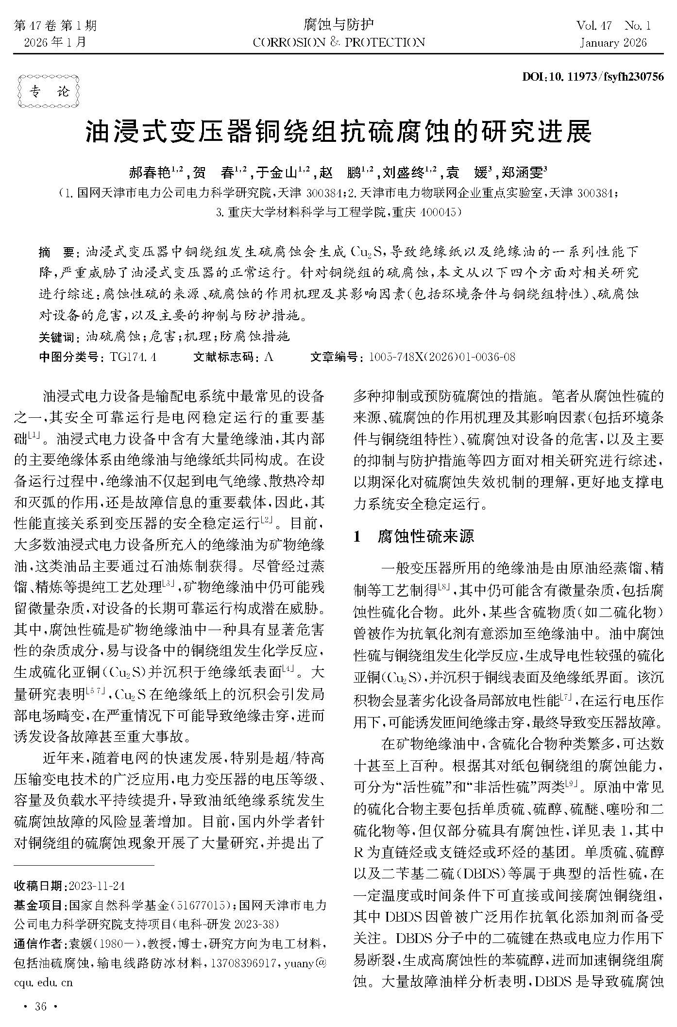 油浸式变压器铜绕组抗硫腐蚀的研究进展