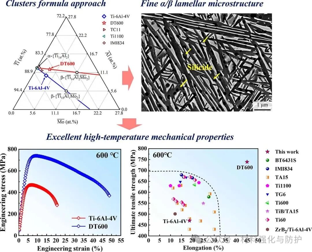 大连理工大学与大连交通大学的研究团队于2025年11月在《Acta Materialia》期刊上发表了题为“A dual-phase Ti-6.5Al-2V-2Mo-1Nb-14Zr-0.1Si alloy with superior 600℃ strength and ductility developed from Ti-6Al-4V cluster formula”的研究论文。团队通过团簇+连接原子模型成分(composition formula)设计方法,开发出新型DT600钛合金,在600℃高温下屈服强度高达623MPa,抗拉强度达739MPa,延伸率可达46.2%,其高温性能媲美主流近α钛合金(如IMI834),同时保持了双相钛合金优异的加工塑性,为高温结构材料设计提供了新思路,论文通讯作者为董闯教授。