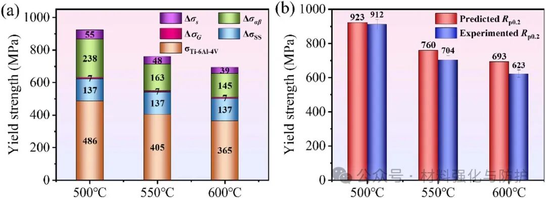 DT600在室温下具有1242MPa的屈服强度和1321MPa的抗拉强度,分别较Ti-6Al-4V提升45%和31%。在500-600℃范围内DT600的强塑协同性较目前已报道的一些常规钛合金体系具有明显优势,600℃时,DT600屈服强度(623MPa)是Ti-6Al-4V的1.7倍,同时延伸率高达46.2%。在强韧性机制方面,塑性的提升归因于动态球化机制的激活,强度提升源于固溶强化(Zr、Mo、Nb贡献268MPa)、α/β相细化(693MPa)及硅化物沉淀(59MPa),且高温下硅化物钉扎界面,有效延缓软化。