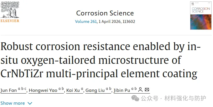 中科院宁波材料技术与工程研究所的研究团队于2026年1月5日在《Corrosion Science》期刊上发表了题为“Robust corrosion resistance enabled by in-situ oxygen-tailored microstructure of CrNbTiZr multi-principal element coating”的研究论文。团队通过磁控共溅射技术在新型CrNbTiZr多主元元素涂层实现了原位氧掺杂,氧掺杂后的涂层腐蚀速率和钝化行为得到了协同优化,自腐蚀电流密度比传统304不锈钢降低了约两个数量级,钝化电位甚至优于钛合金,论文通讯作者为宁波材料所的蒲吉斌研究员。
