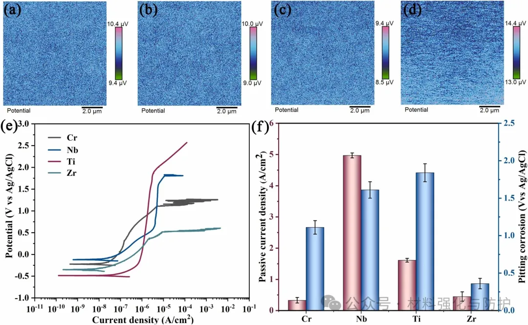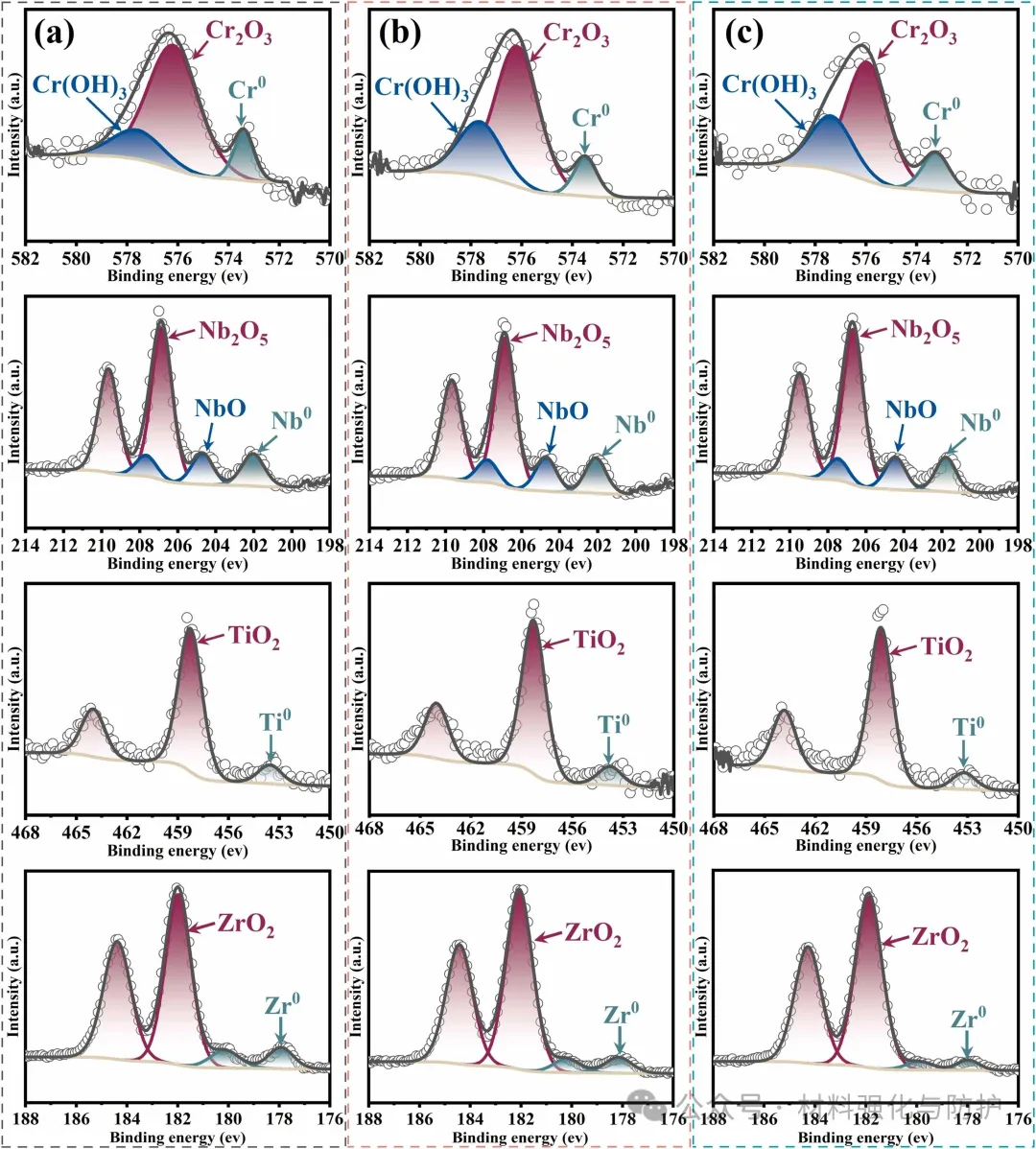 氧掺杂能够促进Zr和Ti的选择性氧化,团队通过热力学计算表明,ZrO2的形成驱动力最大,因此钝化膜呈非晶双层结构,外层形成富Ti/Zr区域作为致密的屏障层,其组成主要以TiO2和ZrO2为主,而内层则为更稳定的以Cr2O3为主的富Cr区域,与其他已报道的耐蚀金属材料或涂层体系相比,M-O2涂层Icorr比传统304不锈钢低两个数量级,ΔEpass同样超过多数高熵合金和传统涂层。