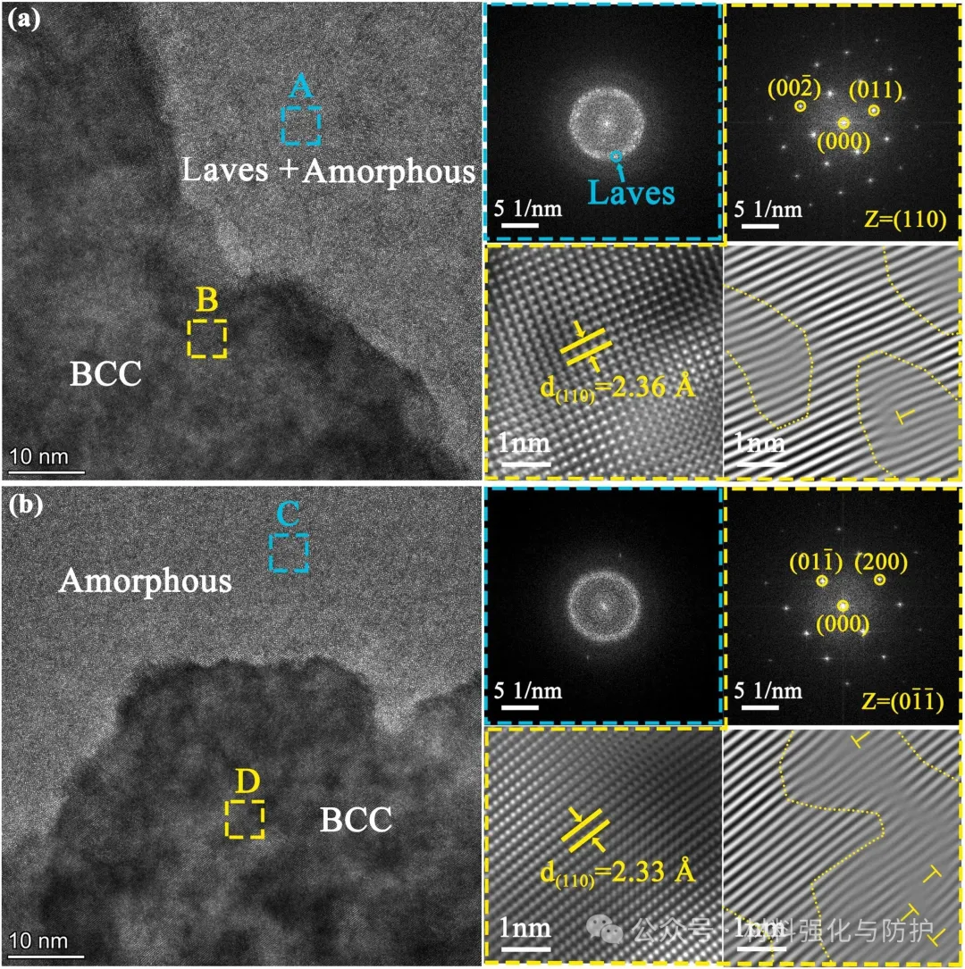 M-O0涂层中存在BCC相和ZrCr2,随着氧含量增加,涂层从BCC+ZrCr2+非晶复相结构逐渐转变为完全非晶态,M-O3涂层仅显示非晶漫散峰。同时,氧的掺入导致晶格畸变和晶粒细化,M-O2涂层中BCC相体积分数降至14.01%,平均晶粒尺寸为59.06nm,元素分布显示,(Nb, Ti)富集在晶相区,而(Cr, Zr)在非晶区分布均匀。