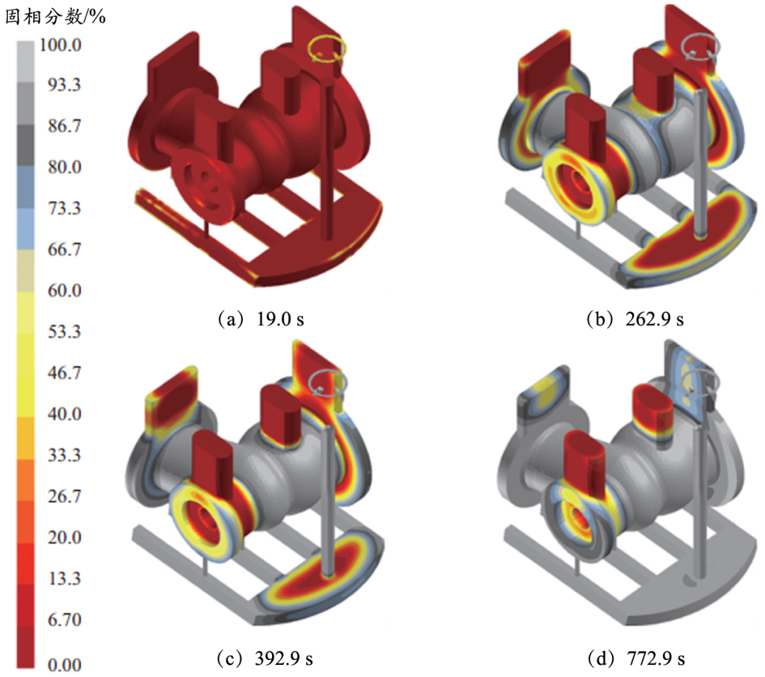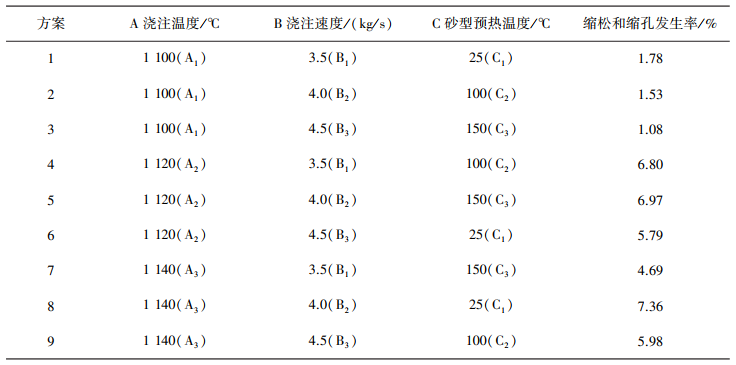 摘 要:根据新型耐高速海水冲刷腐蚀铜合金(ZCuAl7-7-4-2)的热物理性能和船用三通阀铸件的几何形状与结构特点,对三通阀铸件的铸造工艺进行了数值模拟研究。设计了底注式和底注雨淋式浇注系统,并对两种系统的浇铸质量进行分析。数值模拟结果表明,底注雨淋式浇注系统的铸造缺陷更少,且当内浇道集中分布在铸件中部薄璧区时可进一步改善铸造质量。采用正交试验对适配浇注系统的浇注工艺参数(浇注温度、浇注速度、砂型预热温度)组合进行了优化。最终确定的新型耐冲刷铜合金三通阀的铸造方案为:采用将内浇道集中在中部薄壁区的底注雨淋式浇注系统进行浇注浇注温度为1 100 ℃,浇注速度为4.5 kg/s,砂型预热温度为150 ℃。 关键词:耐冲刷铜合金; 数值模拟; 铸造; 三通阀 文中主要图表 (序号为文中序号) 图1 三通阀三维模型 图2 ZCuAl7-7-4-2 合金的热物理 性能 图3 浇注系统设计 图4 底注式浇注系统充型过程 金属液的温度场 图5 底注式浇注系统铸件的凝固 图6 底注式浇注系统铸件的缩松和 缩孔预测 图7 底注雨淋式浇注系统充型过程 金属液的温度场 图8 底注雨淋式浇注系统铸件的凝固 图9 底注雨淋式浇注系统铸件的 缩松和缩孔预测 图10 优化的浇注系统 图11 内浇道分布在中部薄壁区的 底注雨淋式浇注系统充型过程的 温度场 图12 内浇道分布在中部薄壁区的 底注雨淋式浇注系统的凝固 图13 内浇道分布在中部薄壁区的 底注雨淋式浇注系统的缩松和 缩孔预测 图14 内浇道分布在顶部厚壁区和 底部法兰区的底注雨淋式浇注系统 充型过程的温度场 图15 内浇道分布在顶部厚壁区和 底部法兰区的底注雨淋式浇注系统 的凝固 图16 内浇道分布在顶部厚壁区和 底部法兰区的底注雨淋式浇注系统 的缩松和缩孔预测 表2 正交试验的试验因素和水平设计 表3 正交试验方案及结果 表4 正交试验结果分析 结语 (1)根据三通阀铸件的几何形状和结构特点,设计了底注式和底注雨淋式2种浇注系统,结果表明,采用底注雨淋式浇注系统制备的铸件的质量更好。调整底注雨淋式内浇注系统的浇道分布后,发现将内浇道集中在中部薄壁区的浇注系统,金属液的温度分布更有利于不同区域的有序凝固,从而减少了铸件缺陷,提高了铸造质量。 (2)结合数值模拟和正交试验,发现浇注温度、浇注速度、砂型预热温度等3种浇注参数对铸件缩松和缩孔发生率的影响依次减小,最佳的浇注参数组合为:浇注温度为1 100 ℃,浇注速度为4.5 kg/s,砂型预热温度为150 ℃。