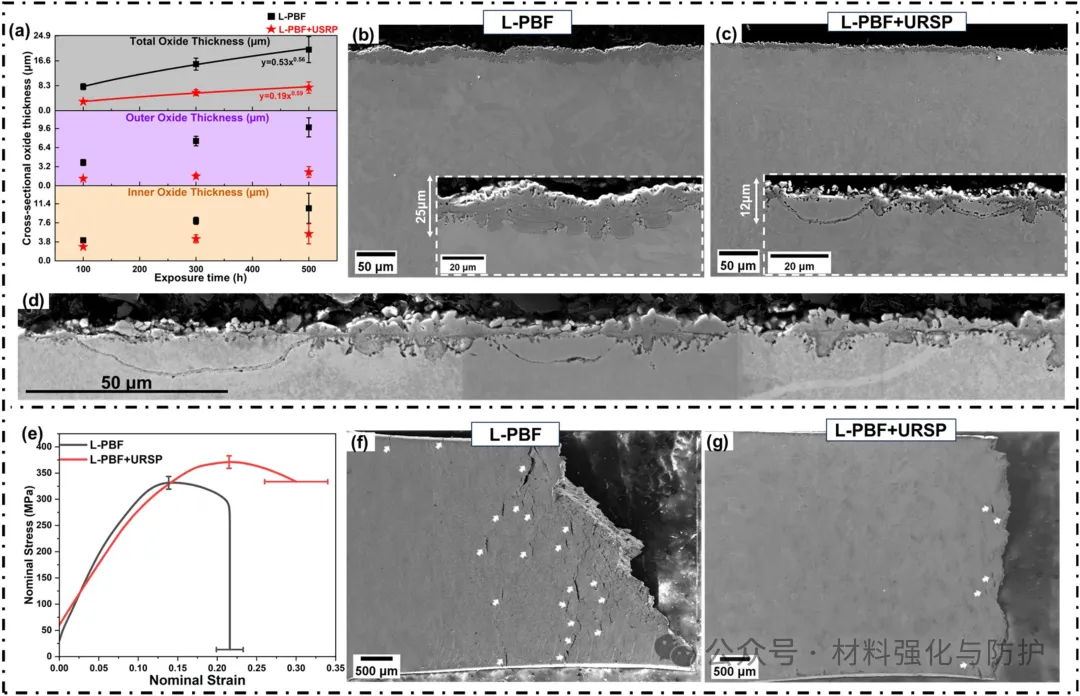 USRP处理后在钢材的表面形成了跨尺度的梯度结构,包括顶部平均粒径149.5nm,深度320nm的纳米晶层和下部微米尺寸的晶层,而未经处理的L-PBF样品表面粗糙且存在微裂纹,USRP处理的样品在高温蒸汽环境中氧化后表现出不均匀的氧化行为,形成弧形选择性氧化区(ASOR)和非ASOR区(non-ASOR)。